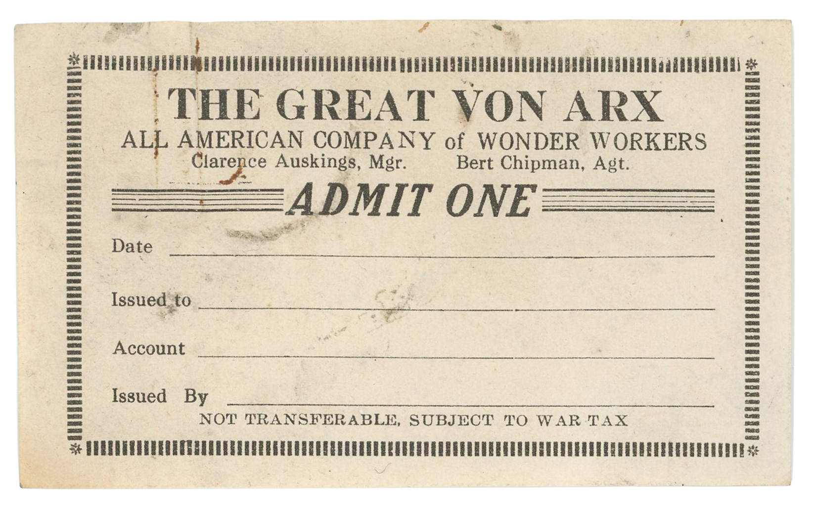 Unused free pass/comp pass for the show of The Great Von Arx, brother of Nicola. Faint pencil writings to verso, else in very good condition.