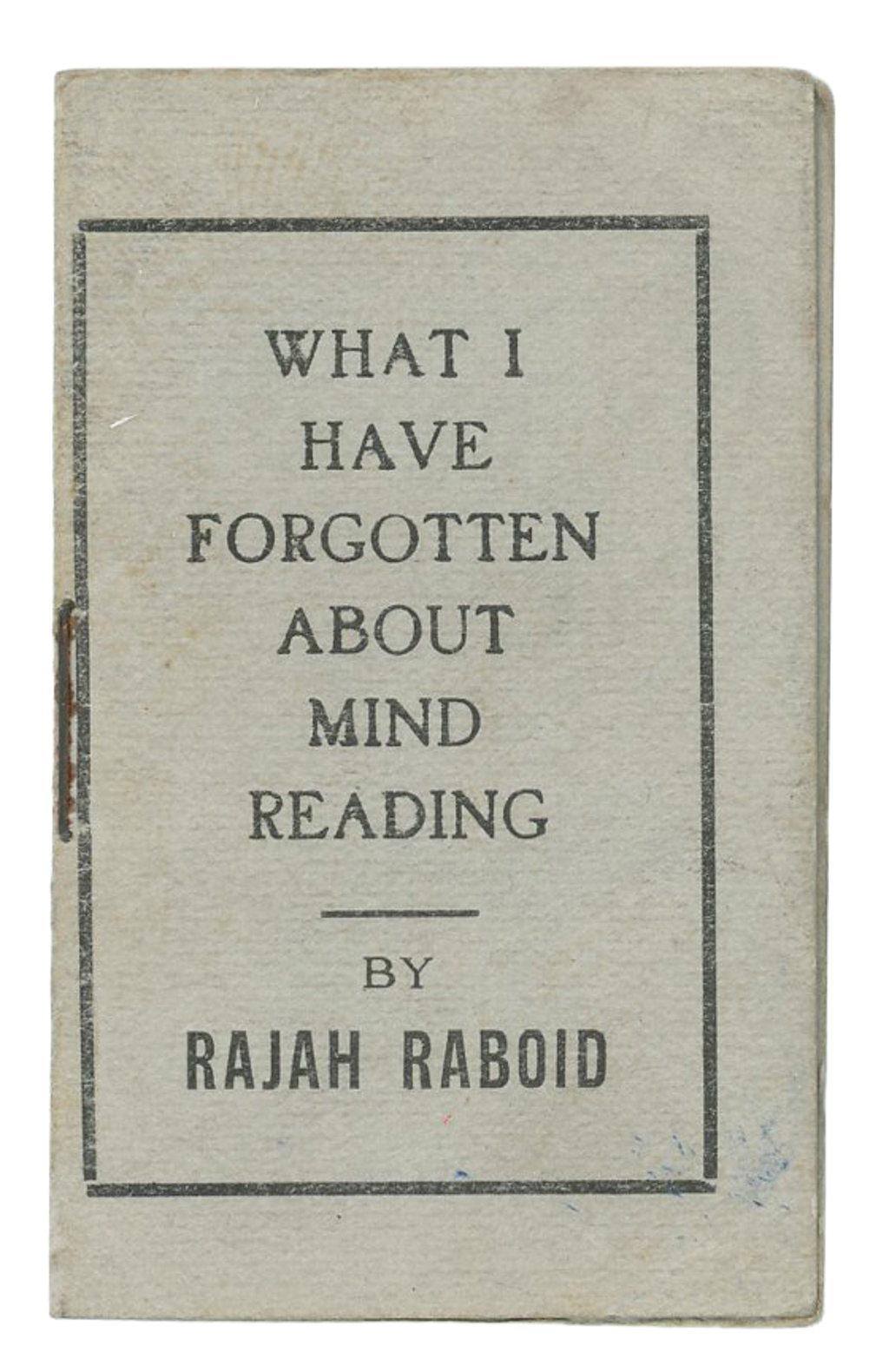 A novelty gag book titled “What I Have Forgotten About Mind Reading” with an empty page inside, "written" by the vaudeville mind reader Rajah Raboid. Raboid is probably best remembered as the inventor of the Sawing illusion that incorporated Johnny and Robert Eck. This tiny booklet is the first we have seen advertising Raboid. Very good condition.