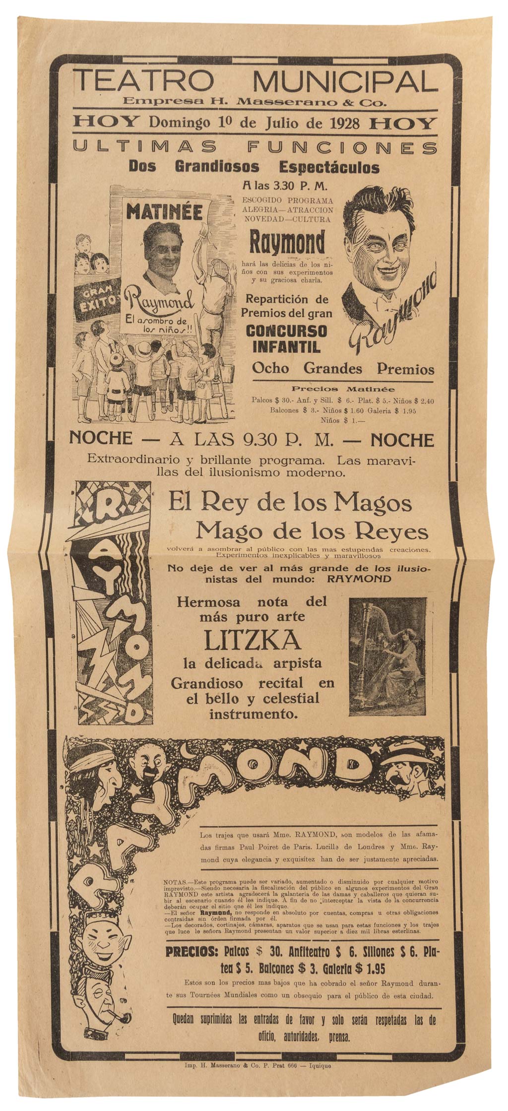 Spanish broadside for The Great Raymond and Litzka at Teatro Municipal. Folded in half, toned, else in good condition.