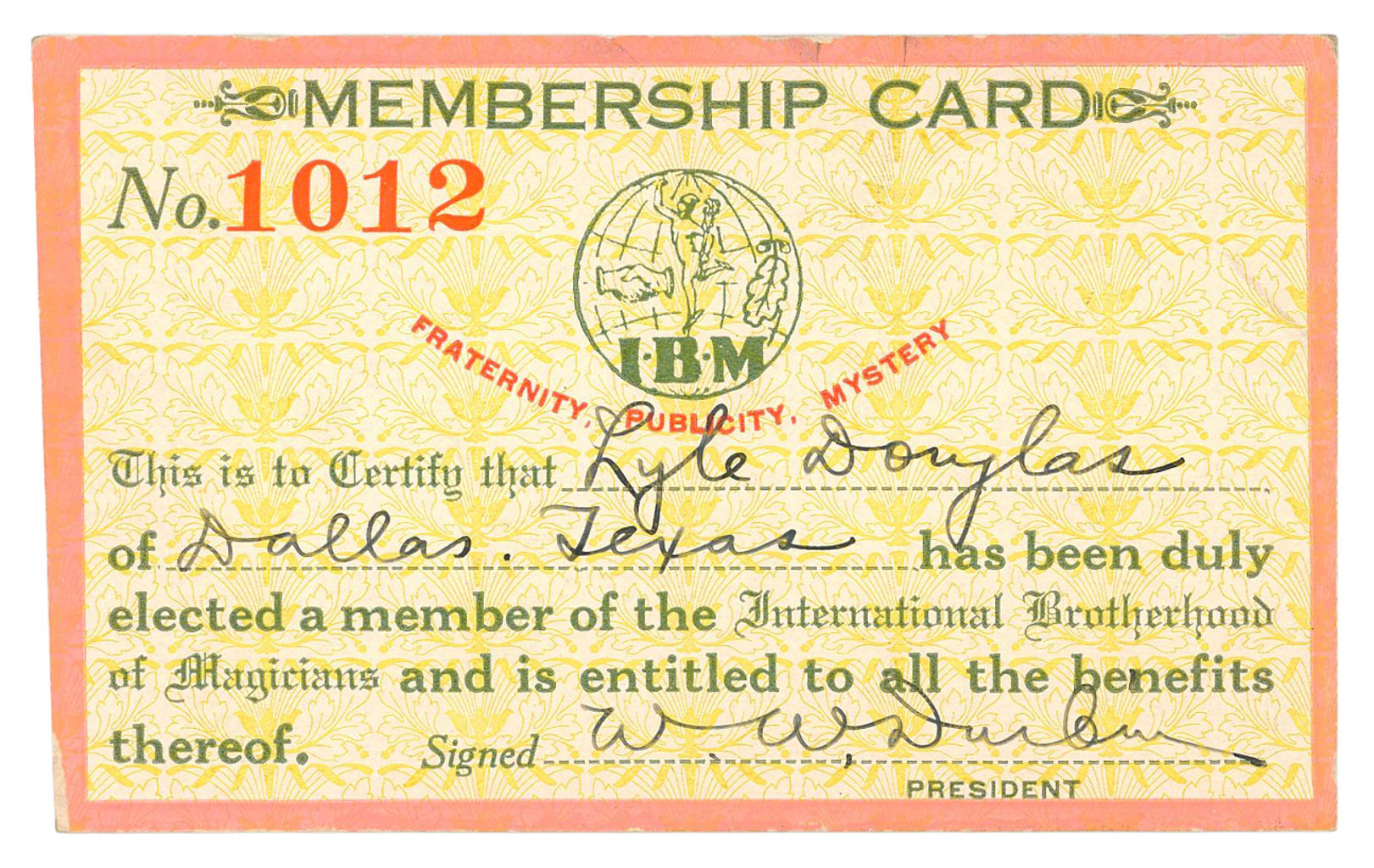 I.B.M. membership card for Lyle Douglas of Dallas, Texas signed by the president W.W. Durbin. No. 1012. Douglas ran the very popular Dallas Magicland shop for decades. Very good condition.