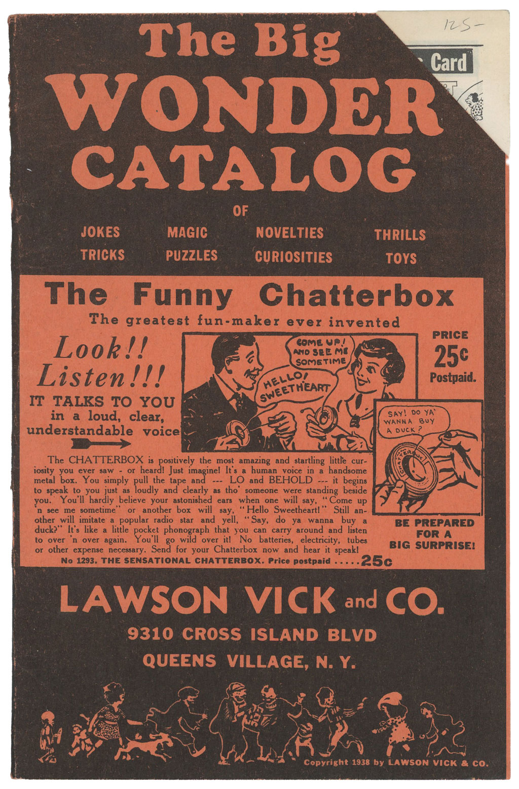 A real rarity in twentieth century American magic catalogs, as this is the first catalog issued by the man who would go on to be known as Vick Lawston who operated his "House of 1000 Mysteries" for years. Pictorial wrappers, illustrated, 42 pages. One corner clipped, though this appears to be intentional, as the only other example of this catalog we have traced is also cut in the same location. Includes a typed letter on Lawson Vick’s Fun Shops letterhead laid in. Very good condition.