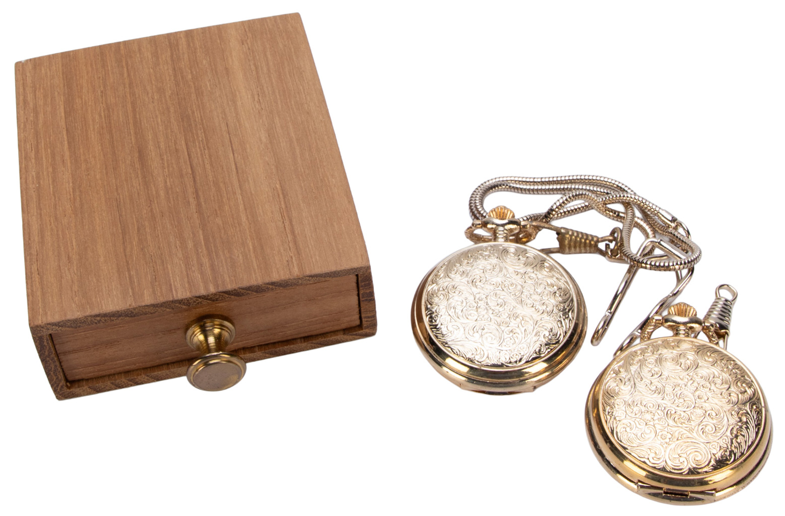 You take the watch from your pocket. The watch has a chain. You open the watch case and display the watch face. Ask a spectator to set the time and close the case. Unlink the watch from the chain and put the chain back into your pocket. Introduce a beautiful drawer box made of wood. The spectator puts the watch into the box and closes the drawer. Say the magic word, and when you open the box, the watch has disappeared! The drawer is empty! Slowly, you take the chain from your pocket. Linked to the chain is the watch! Let the spectator open the case to verify the time he has set. It is correct! Includes instructions. Very good condition.