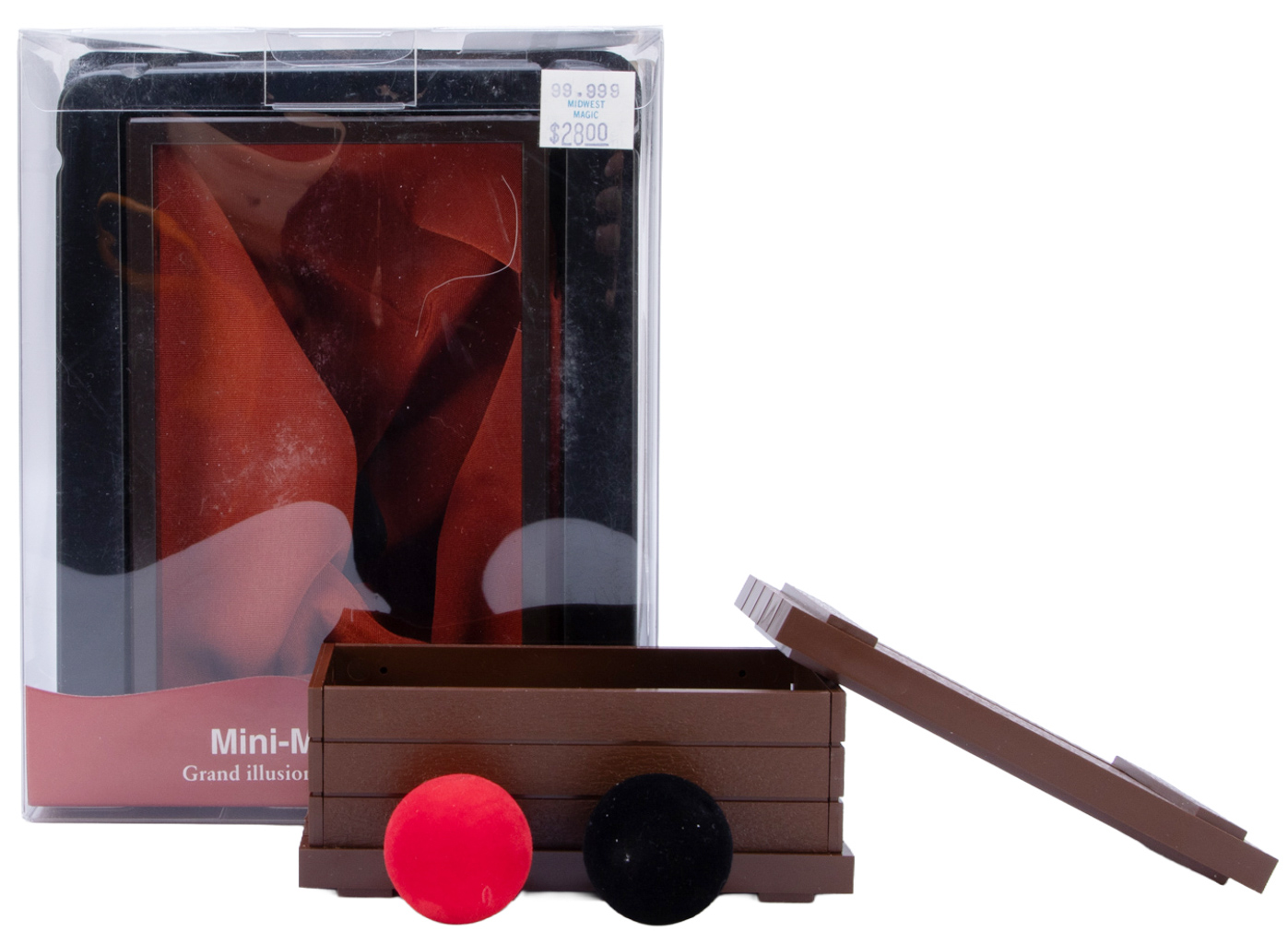 You place a red ball inside a box, and close the lid. You then place a black ball on top of the lid. A small curtain is used to cover the box. When you drop the curtain, the black ball, which had been on top of the box, instantly changes places with the red ball inside the box. Includes instructions. Very good condition.