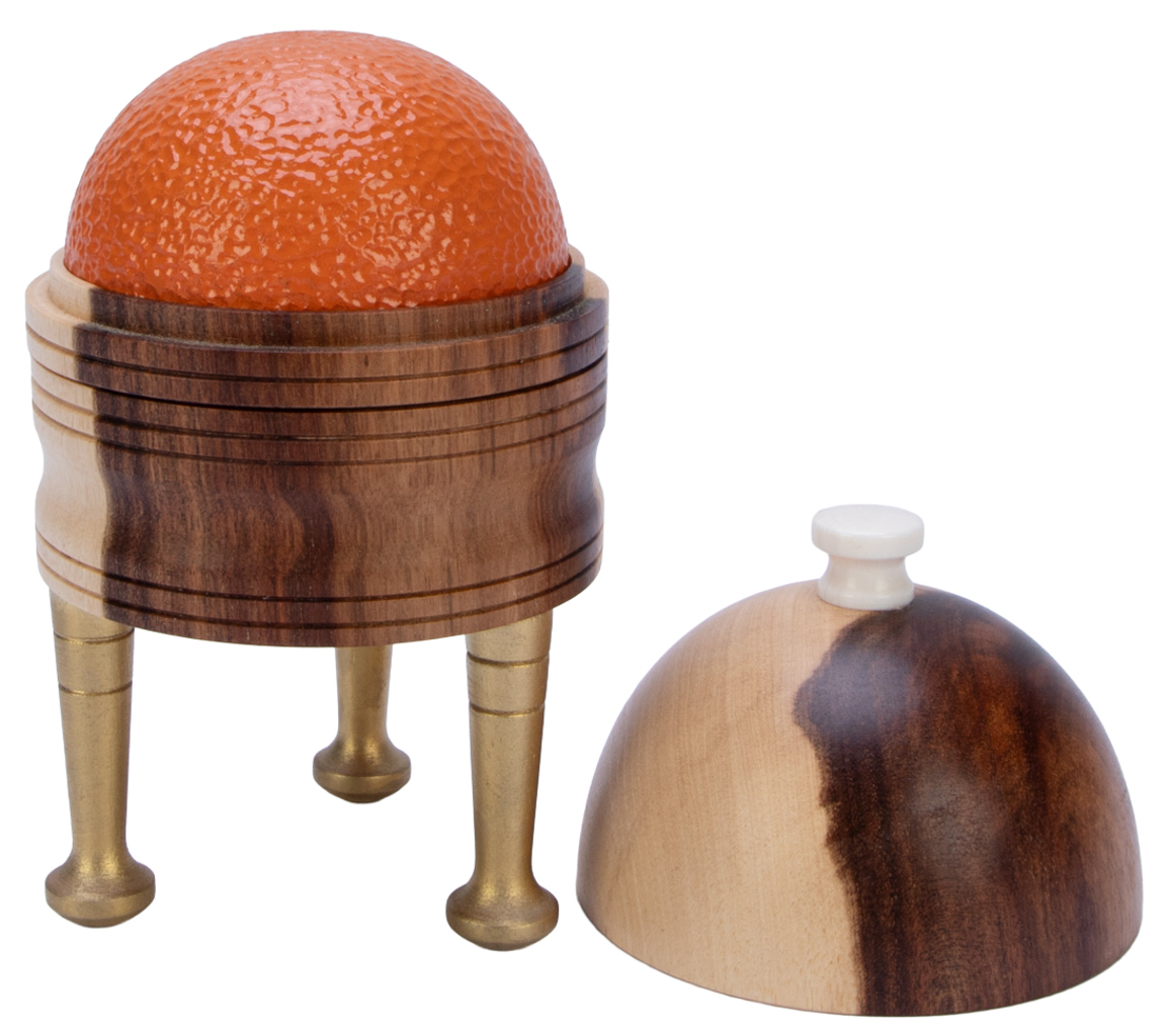 A faux orange vanishes, appears, and transforms into a handkerchief inside this turned segmented hardwood vase. Modeled after a design by Harlan Tarbell. Hallmarked (by, we believe, Angelo Iafrate of Majic Brand Woodturning). Number 109. Excellent condition.