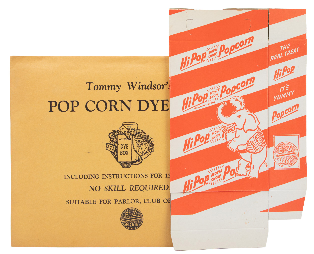 Silks can be made to vanish or exchange within the cardboard popcorn container. Includes one dye box, instructions and original packaging. The color of the envelope may vary. Very good condition.