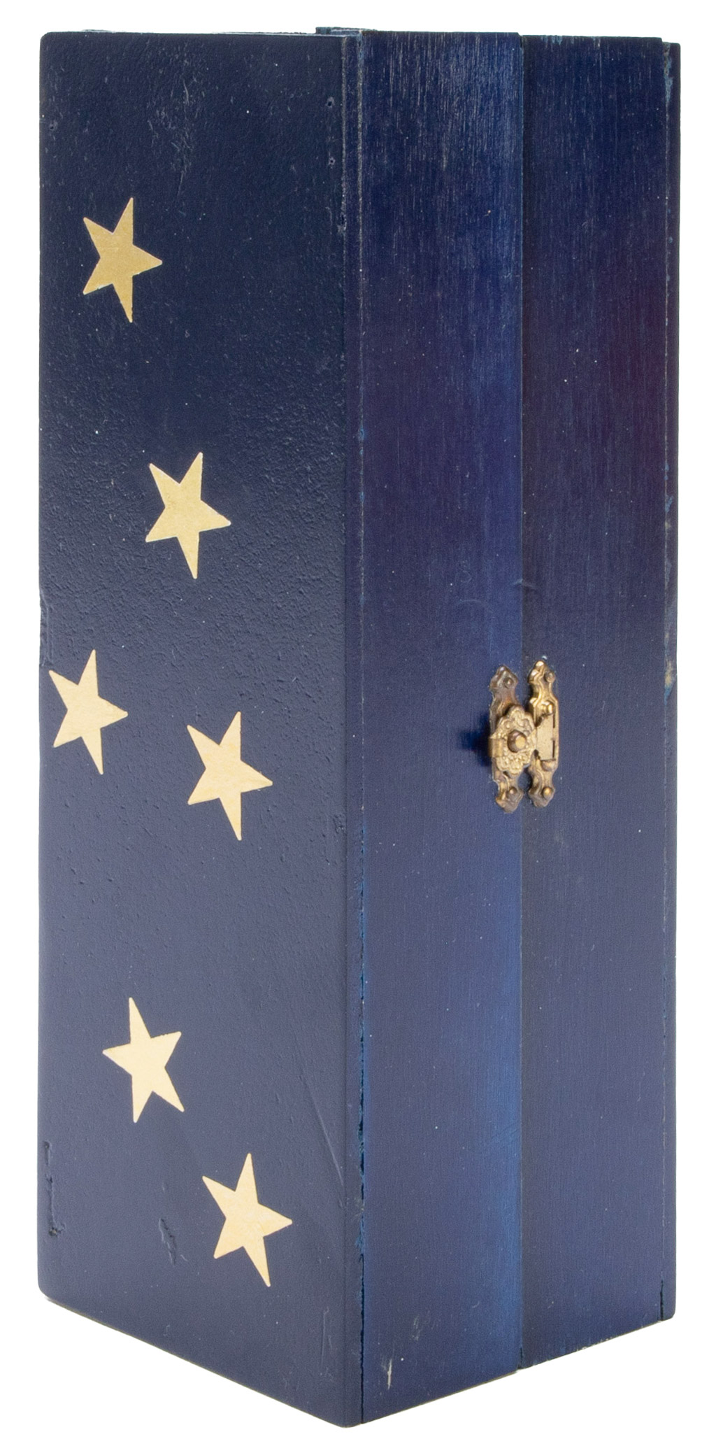 A painted wooden tube is shown empty by hinging it open. After closing it, a quantity of silk are produced from within. Hinges feel slightly loose, else in very good condition.
