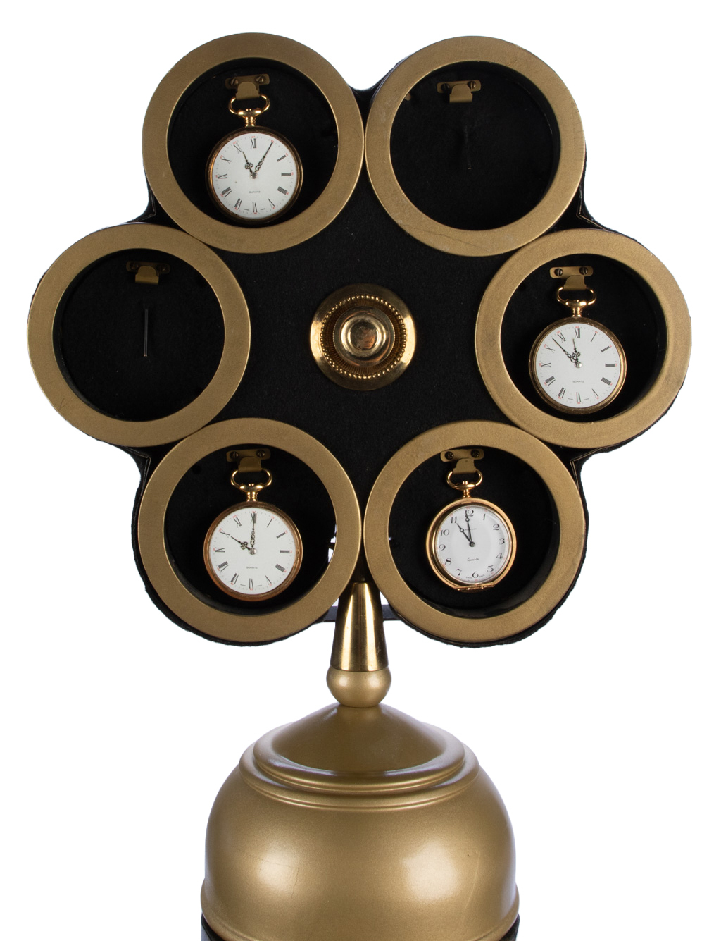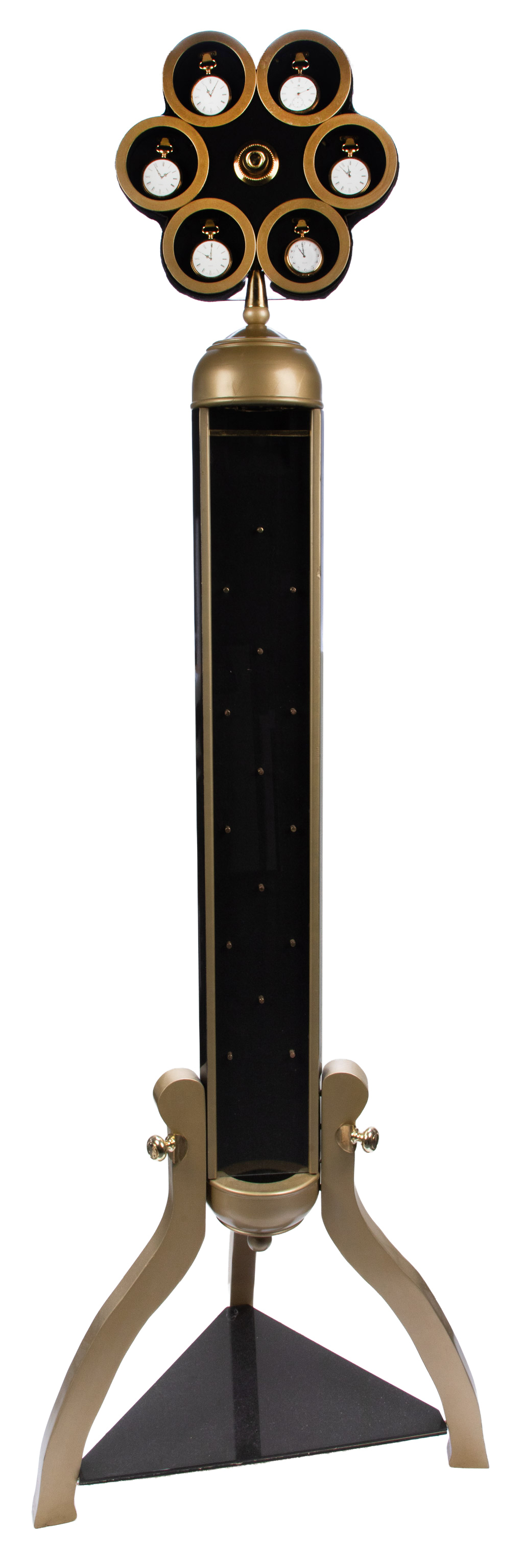 Six pocket watches are produced at the magician’s fingertips. Each is placed in a holder at the top of an elegant stand. Then, one at a time, the watches vanish from the display and cascade down the front of the stand, clacking back-and-forth, as if walking down the rungs of a ladder. They fall into a brass top hat below the stand. For a finale, the performer reaches into the hat and produces a ringing alarm clock. Modeled on the Watch Ladder, conceived and constructed by Jesse Thornton for Abbott’s Magic in the 1940s, a prop so rare that only two or three are known to exist. This model, a mechanical masterpiece, is Nick Ruggiero’s version operated mechanically (but not electronically), via a variety of coordinated mechanisms concealed in the “star” at the top of the stand and just above the glass-front ladder. One of less than 12 units manufactured. Very good condition, and essentially as-new condition.