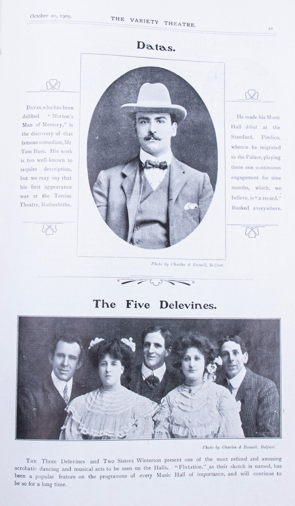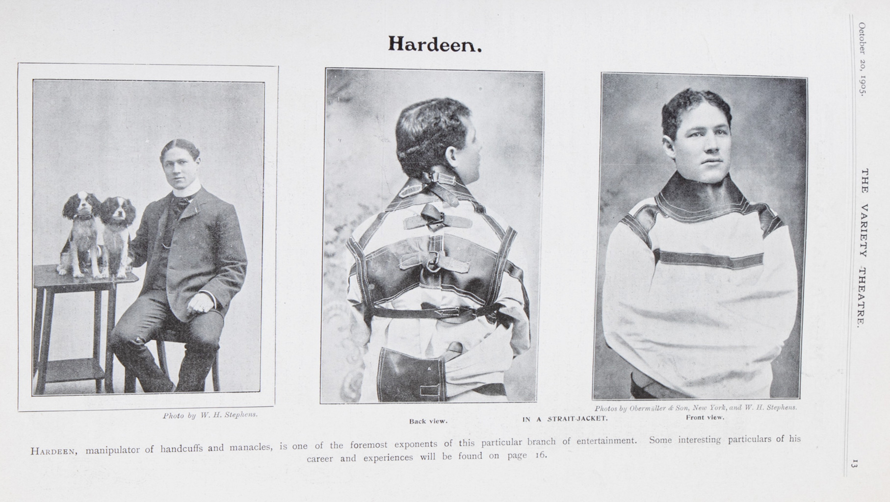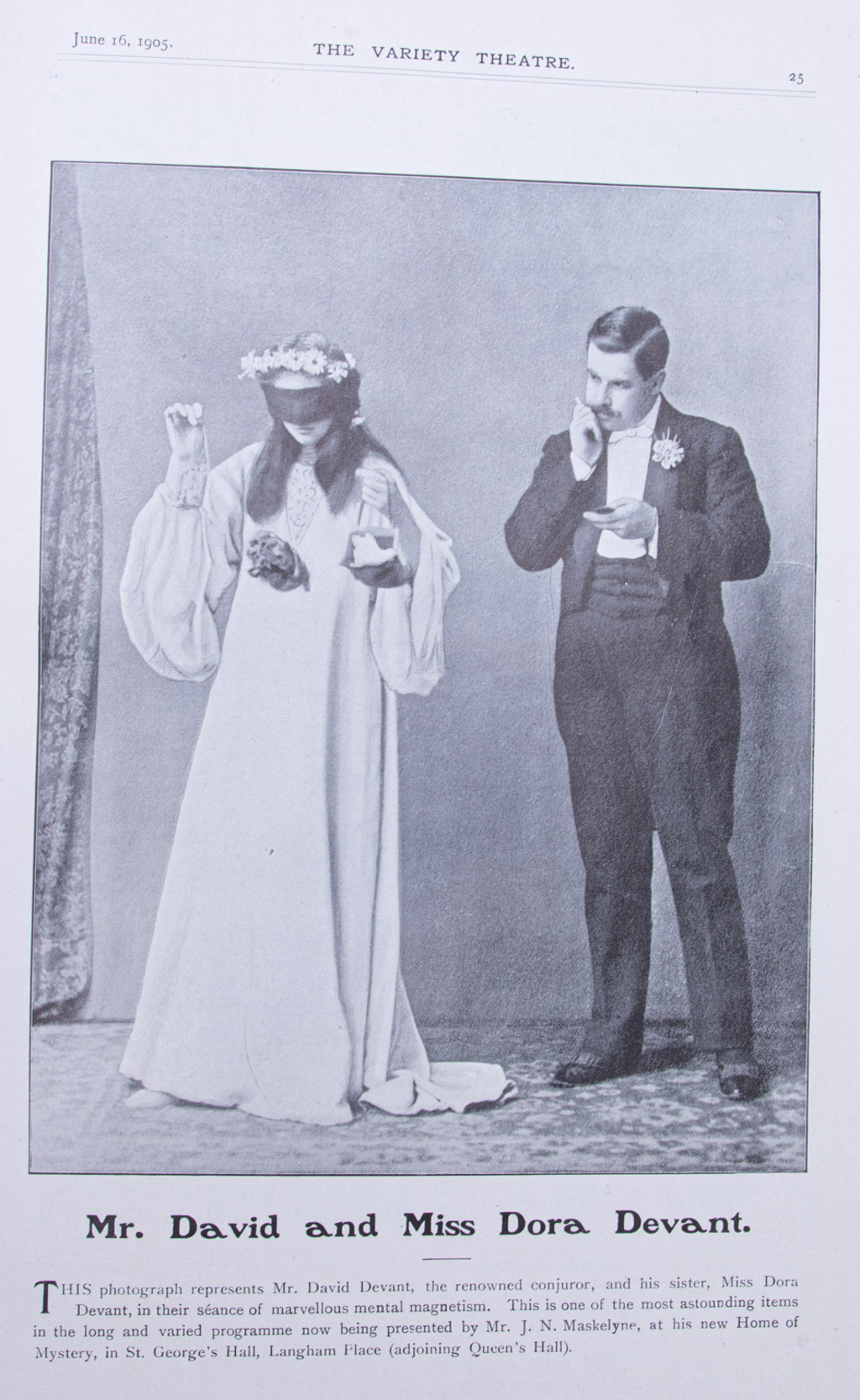 A pair of The Variety Theatre magazine issues Vol. I No. 6 and Vol. II No. 24 featuring photographs (some full page) and or stories regarding Dr. Walford Bodie the hypnotist, Mr. Fred Russell the ventriloquist, Mr. David and Miss Dora Devant, Hardeen, and Datas “Morton’s Man of Memory.” Toning and wear, else in very good condition.
