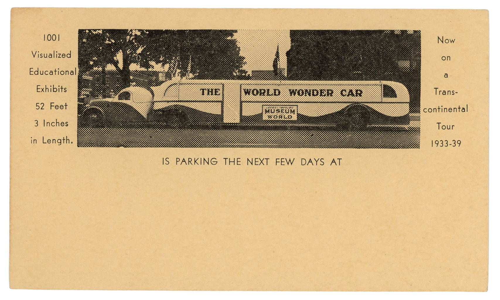 Blank postcard advertising The World Wonder Car, "1001 Visualized Educational Exhibits." Includes black and white halftone image of the Wonder Car. Minor discoloration.