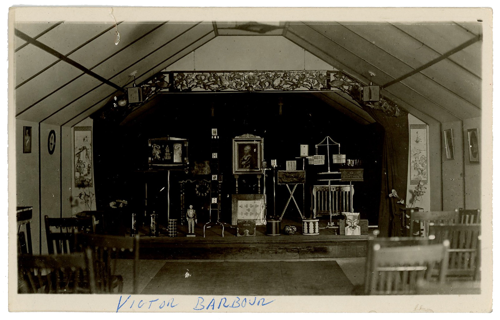 Real photo postcard of Victor Barbour's stage re-decorated. Unused, with writing on the front and back, and a tear at the top. Good condition.