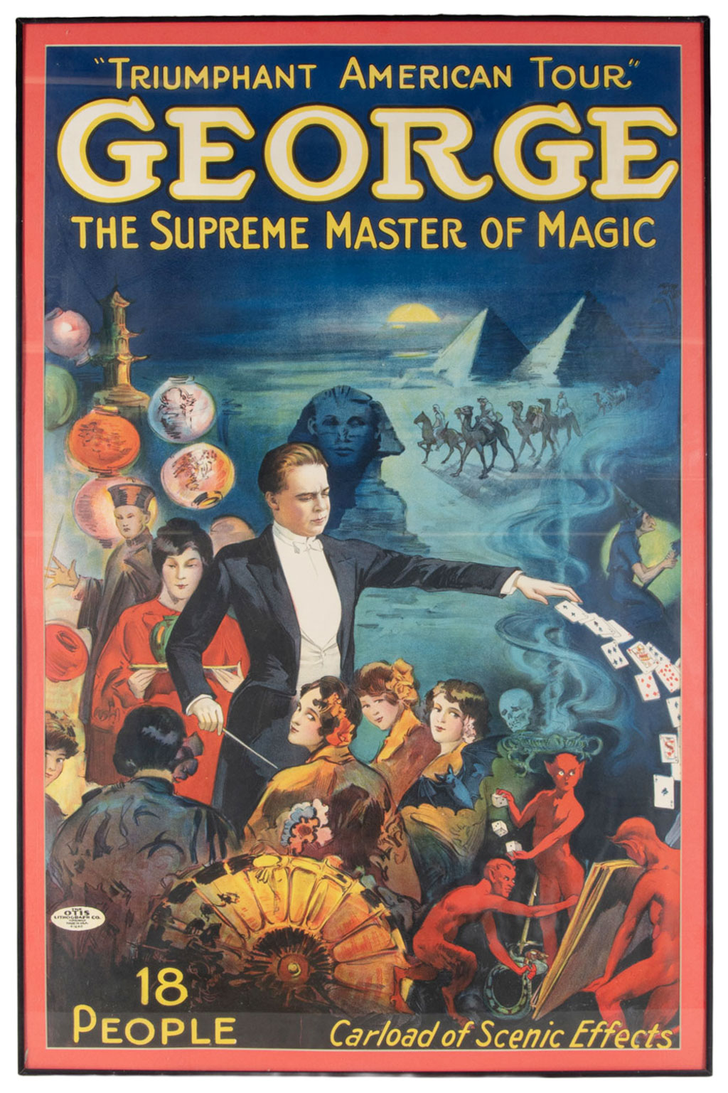 One-sheet color lithograph depicting a striking full-length portrait of George with playing cards shooting from his hand while Geishas and demons look on. George's "Triumphant American Tour" never took place, and consequently, his posters were never used. Framed, not inspected out of the frame. A.