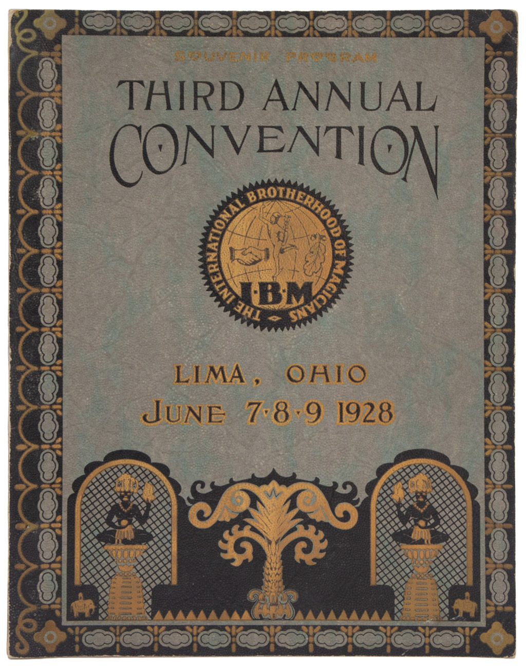 Oversized souvenir program for the Third Annual Convention in Lima, Ohio. Includes performances by magicians such as Thurston, Hellstrom, Blackstone, Durbin, Lindhorst and many others. Includes a color Kellar lithograph frontispiece, hundreds of photographs, and a folding photographic plate picturing delegates to the two previous IBM conventions. Laid in is the smaller folding printed program for the event. Mild toning, small chips to spine, else in very good condition. Considered by some to be the finest souvenir program for a magic convention ever produced.