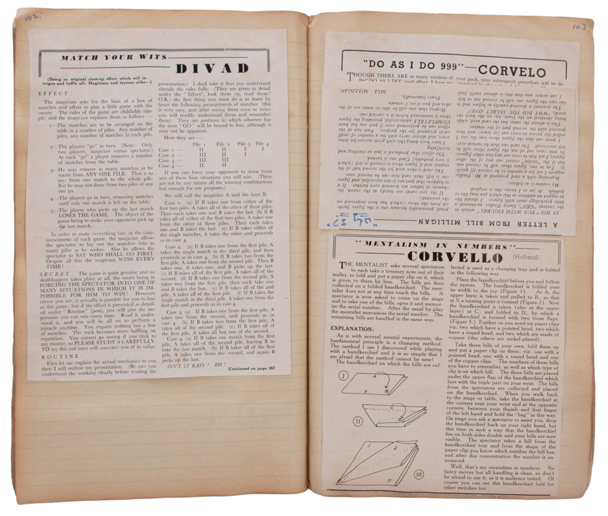 Magician’s scrapbook filled with handwritten routines of various tricks, along with clippings from books and magazines, and instruction sheets. Extensive and detailed instructions for popular effects are included, which occasionally feature crude drawings. Ex-libris Dion Matthews (who we believe to be the writer and compiler of the book), gifted to Eddie Dawes by Bryan Houghton, with a gift notation pasted down, and signed by Houghton. Over 100 pages, and including a handwritten index of the contents on the first leaf. Hinges loose, chips to spine, fair to poor condition, but a unique document of mid-century British magic effects.