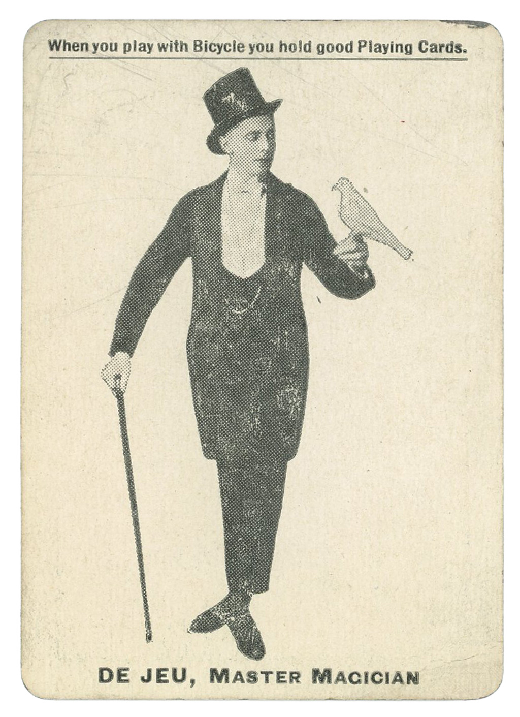 Throw-out card for De Jeu, Master Magician holding a pigeon. De Jeu was a Cleveland-based magician who would later perform as De Jen. He had a long career in vaudeville, theaters, lyceum, and chautauqua. Mild wear and toning, else in very good condition.