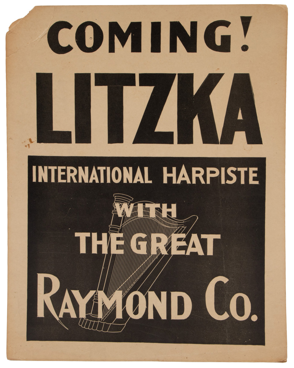 Window card for Coming! Litzka: International Harpiste with The Great Raymond Co. One corner chipped, toning, C.