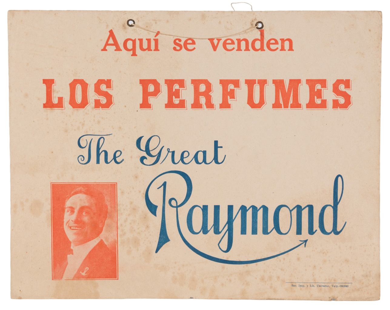 A window hanger of The Great Raymond endorsing a perfume company. Mild soiling and wear, else in good condition.