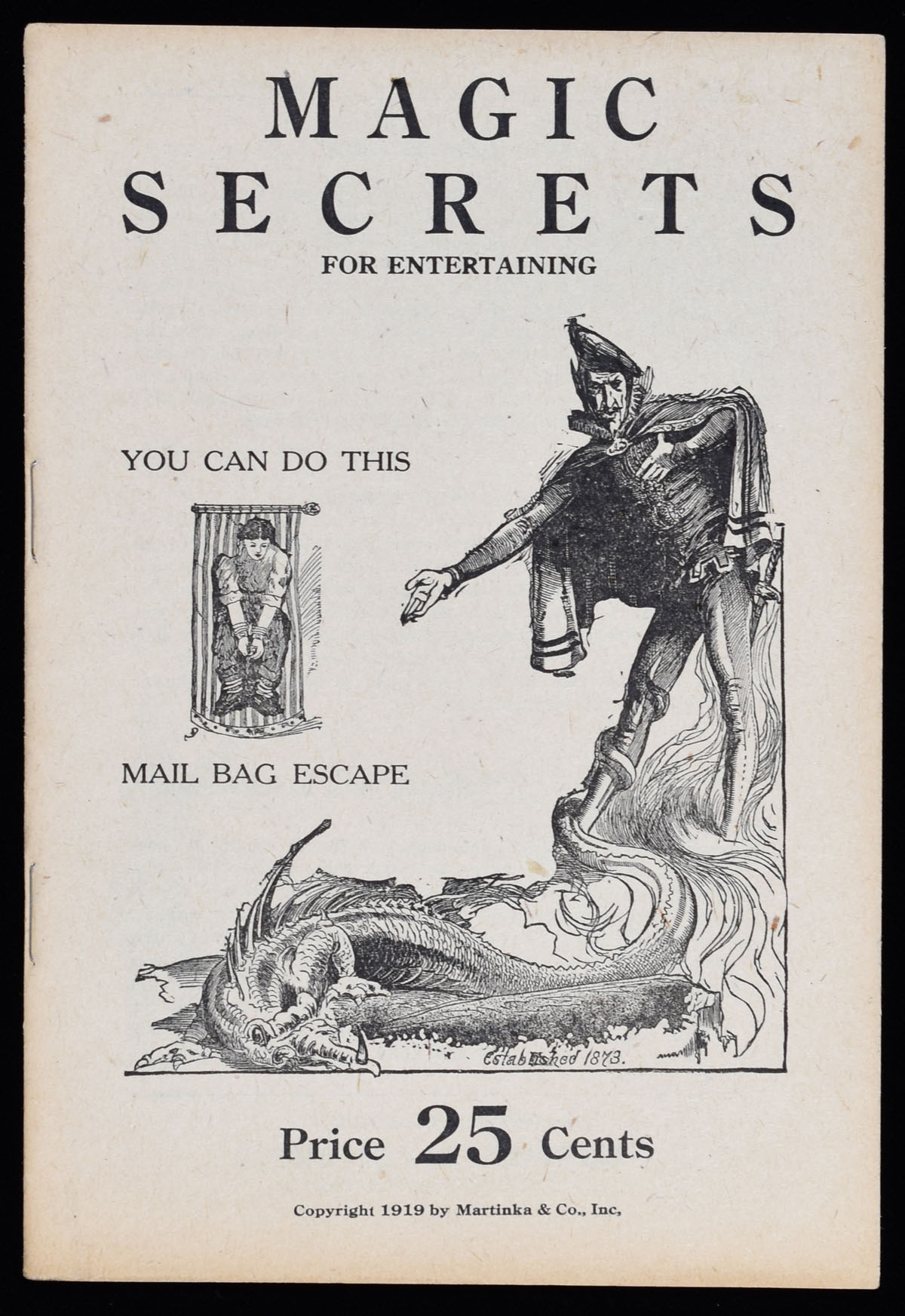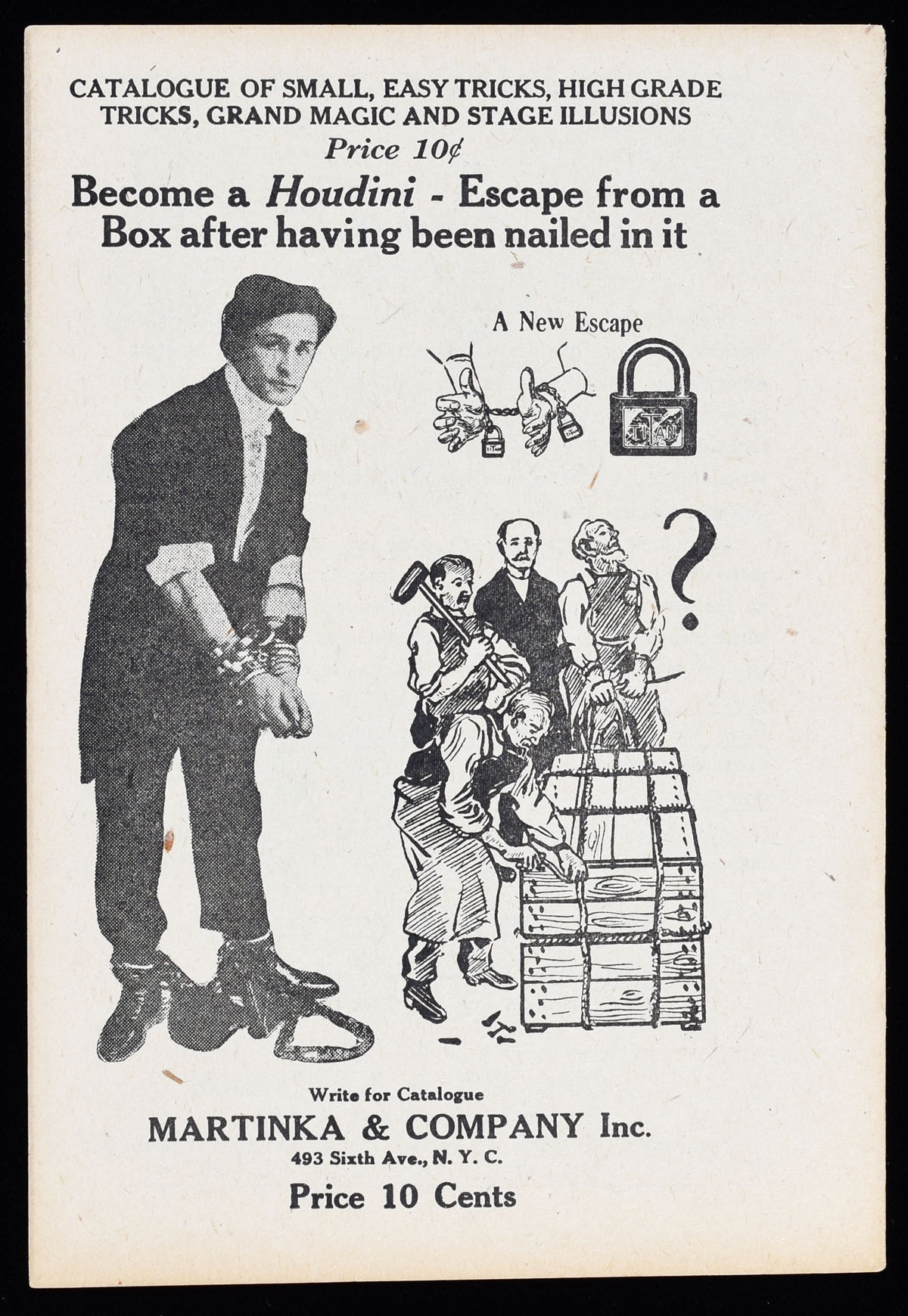 A pamphlet describing a variety of tricks featuring apparatus available from Martinka. Image of Houdini on back in shackles, image of his famous Mail Bag Escape on front. Some toning to edges, else very good.