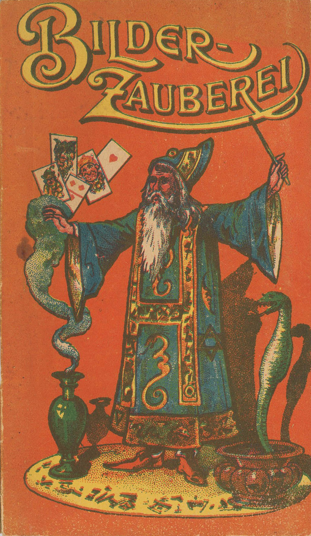 Vintage German "blow book" in which the pages change when the magician flips through them repeatedly. Colorful pictorial wrappers with color and black-and-white illustrations. Mild toning and wear, else in very good condition.