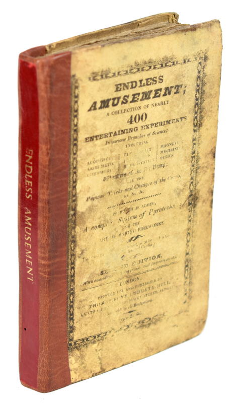 A Collection of Nearly 400 Experiments in Various Branches of Science. Second edition. Folded frontispiece, 218 pages. Three-quarter leather over cream boards. Rebacked leather, hinges strengthened with cloth tape. Ex-libris Trevor H. Hall. Toole Stott 257. Some wear and soiling to the boards, toning to edges, good condition.