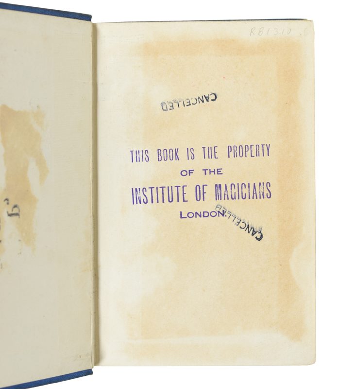 Three parts in one volume. Portrait frontispiece, illustrated. Pictorial blue cloth with gilt stamping on cover and spine, gilt top edge. Institute of Magicians rubber stamp on front free end paper. Spine slightly loose, corners bumped, some wear to edges, good condition.
