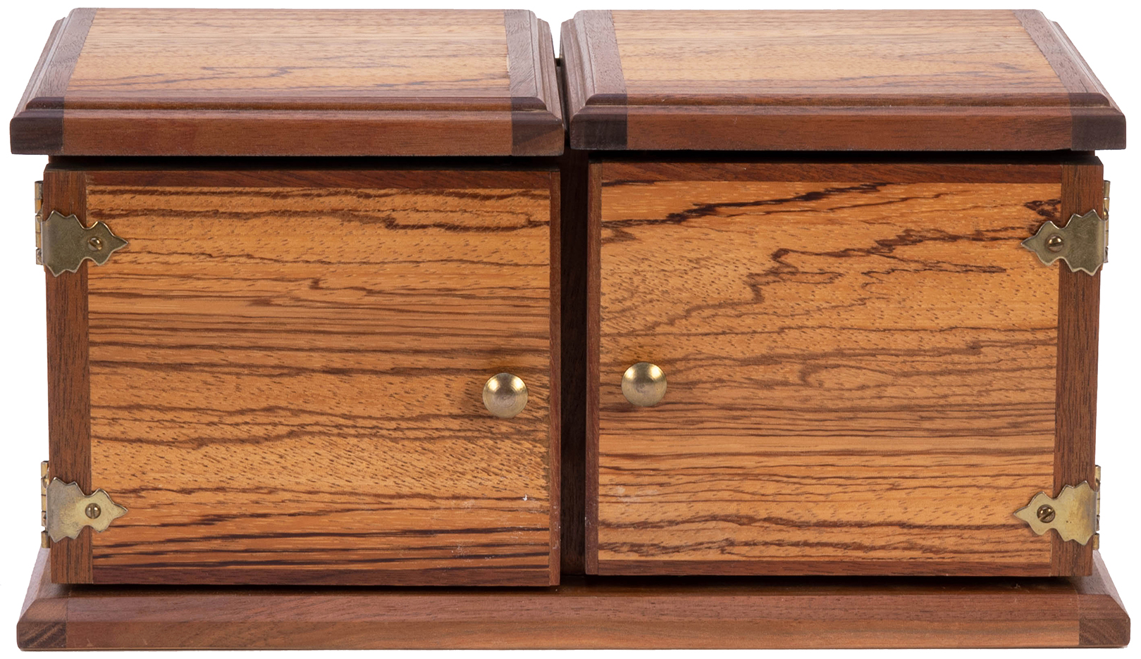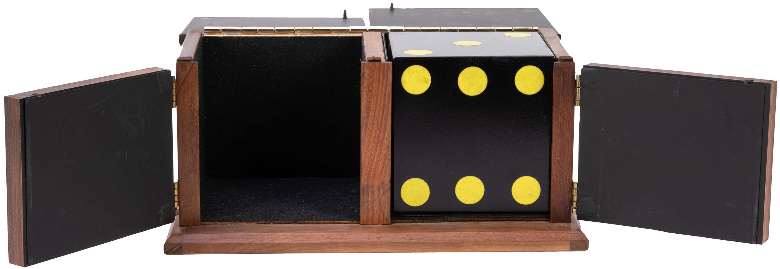 A large black die vanishes from within the finely made inlaid wooden box and reappears elsewhere. Includes sliding sound effect and two double door gimmicks. The die measures 4". Hallmarked. Excellent condition.