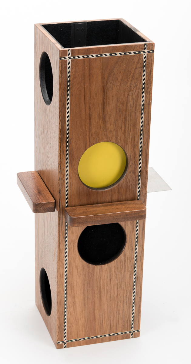 Solid wooden block mysteriously passes through two steel blades bisecting a wooden tube. Large size. Hallmarked.