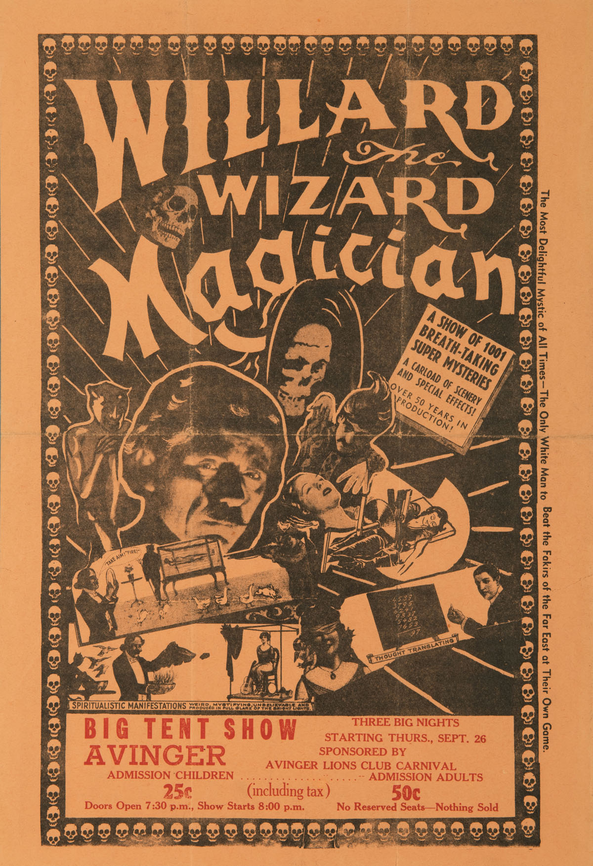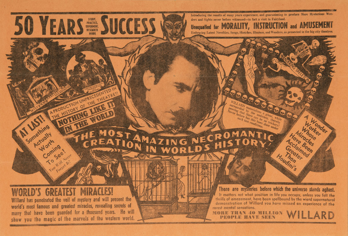 Two-sided broadside for Willard the Wizard Magician, imagery lifted from other sources, including Charles Andress. "The Most Amazing Necromantic Creation in World's History." Old fold lines with one tear from the right margin. Unmounted.