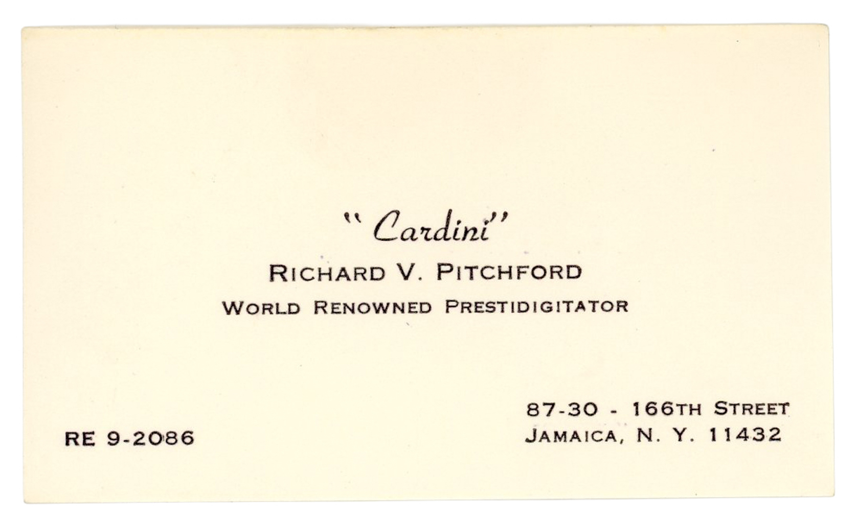 Business card for Cardini reads “Richard V. Pitchford, World Renowned Prestidigitator.” Very good condition.
