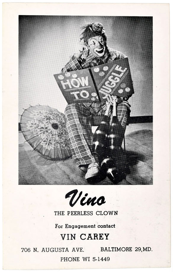 Black and white photographic postcard for Vino the Peerless Clown, Baltimore, Maryland. Image of Vino reading "How to Juggle." Biography on verso. Minor discoloration and edgewear.