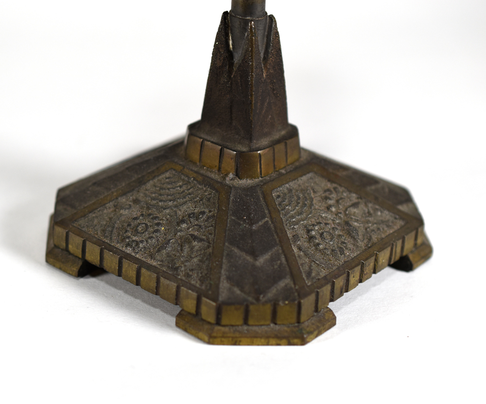 Antique card rise with an iron base patterned in Art Deco-style motifs. Frame in which cards rest is wooden with a metal divider. Various places for string to be run or other gimmicks to be hidden, but does not include string or other mechanism. Frame a bit loose and worn, metal divider a bit bent. Underside of base shows oxidation. Generally in good condition for age.