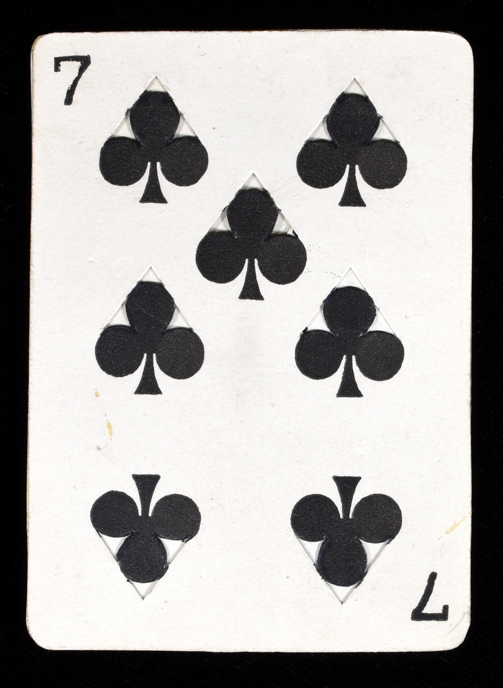 The seven of clubs turns to the seven of spades before your eyes. Mechanized lever in back creates change. Mild toning and edgewear, good condition.