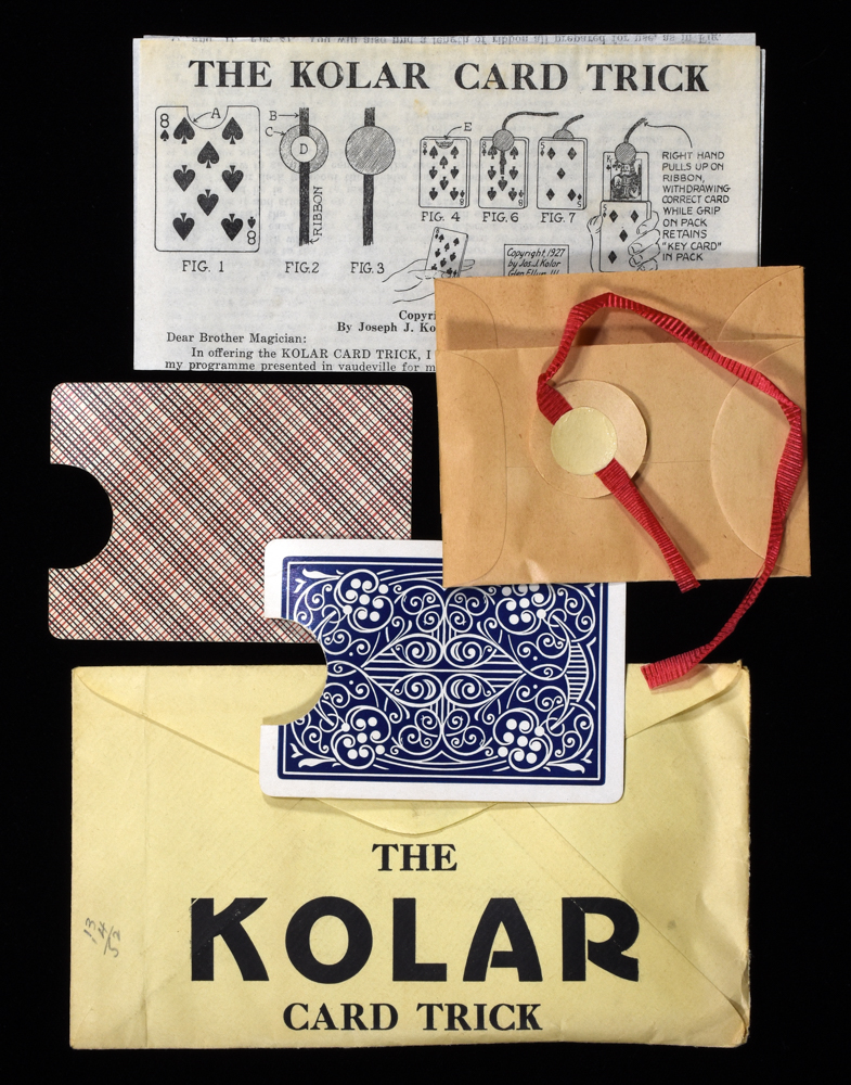 The wrong card is attached to a ribbon with a sticker and put into the deck. When the ribbon is pulled up, the right card is attached. Instructions included. Original packaging worn with creases and small tears but contents in very good condition.