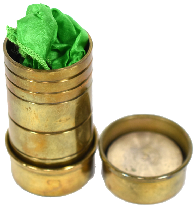 For vanishing handkerchief. The handkerchief is pushed in the brass case, and spectators are given a last, final peek at it inside, yet when the lid is removed a moment later, the silk is gone. Includes green silk. Some tarnishing to the surface, else in good condition.