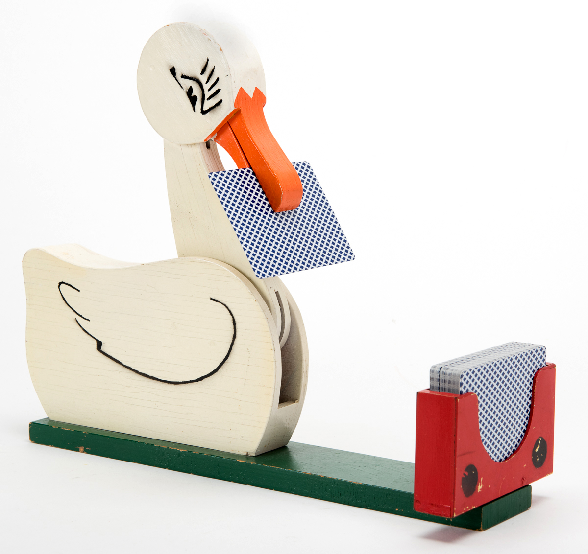 Wooden duck that picks chosen cards from a deck placed in a feed box in front of it on a small platform by grabbing them with its bill. No hallmark.