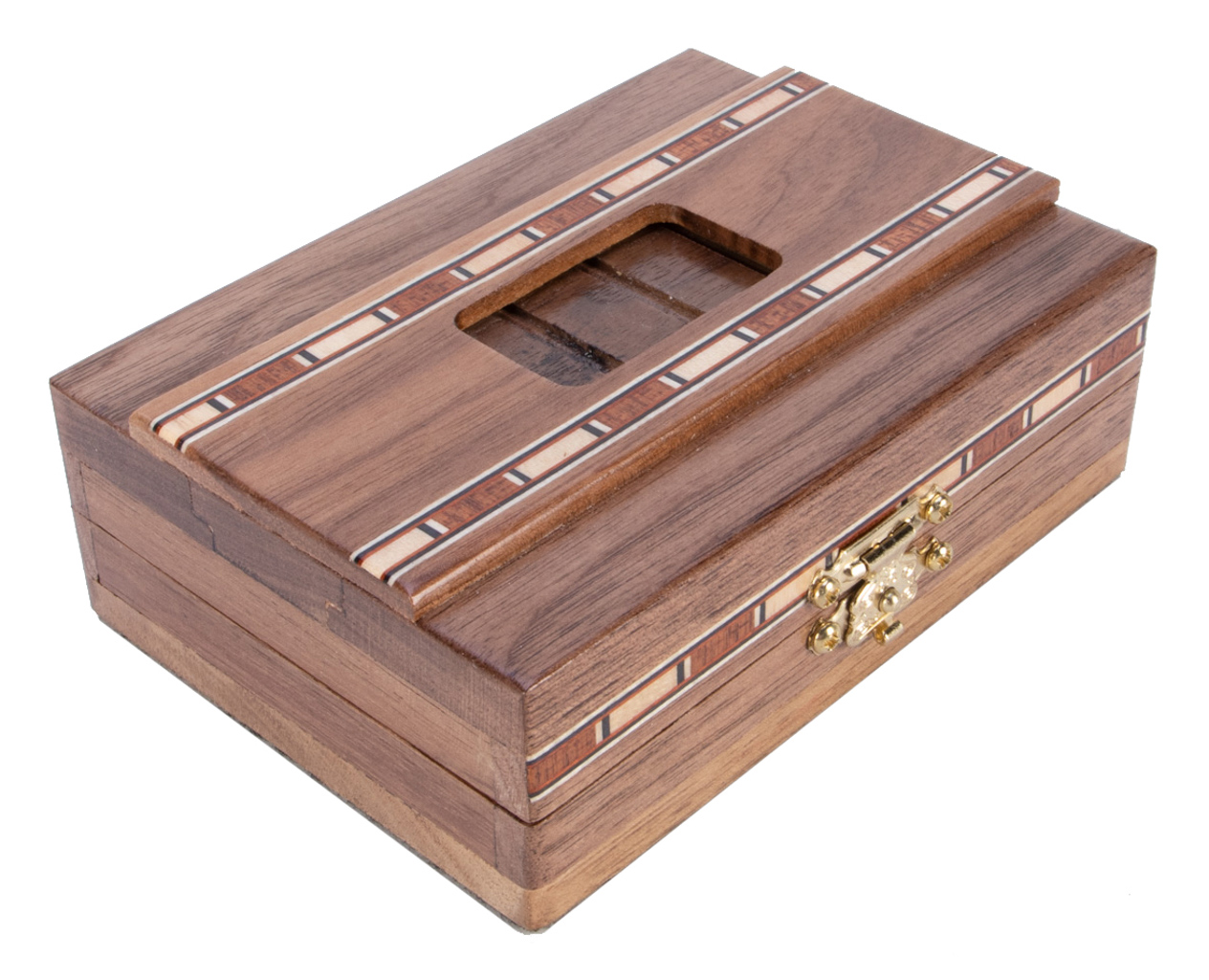 Magnetic card box with a sliding panel at the top, and inlaid wooden exterior. Very good condition.