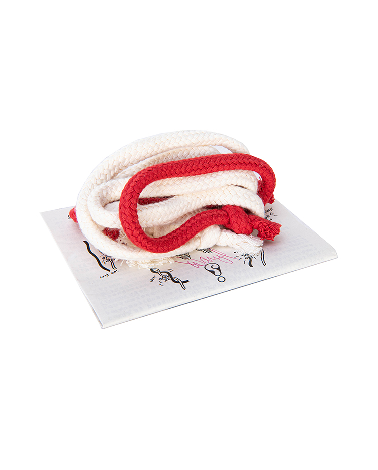 A knot, which is tied in the middle of a piece of white rope, visually slides to one end where it is plucked off! A red piece of rope is introduced and both ropes are cleanly displayed. A knot is tied near one end of the white rope then both ropes are twirled together. When they are untwirled, the knot is seen to have jumped! The red rope now has the white knot that is no longer on the white rope. The white knot visually slides off the red rope then it is squeezed back on. The knot is then untied and it is seen to actually be a five inch white section of the red rope! Both ropes can be completely examined. Includes instructions which is signed by Daryl. Excellent condition.
