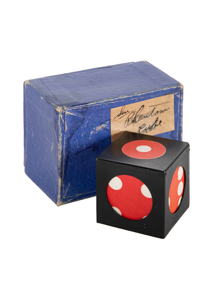 A cube spotted to resemble a die, and a metal box with open sides are exhibited. The tube is dropped into the box where it can be plainly seen. It is now covered with the handkerchief and placed on top of a borrowed derby hat; removing the handkerchief - to the astonishment of the audience, the box is found empty and the die is found underneath the hat. Apparently it has passed through the hat without injuring it in any way. Includes the original box and instructions. Uncommon in this size with the original packaging. Very good condition.