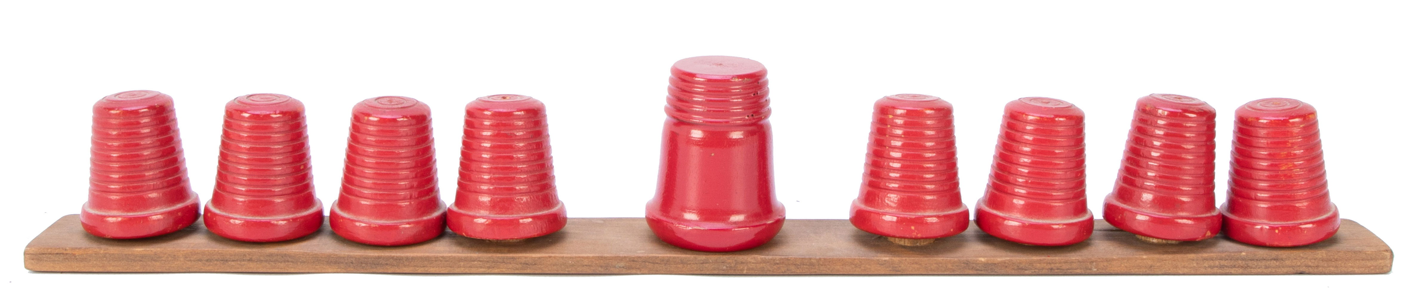 A wooden manipulation thimble display including eight thimbles that rest on both sides with one small and large thimble at the center. Mild wear, else in very good condition.