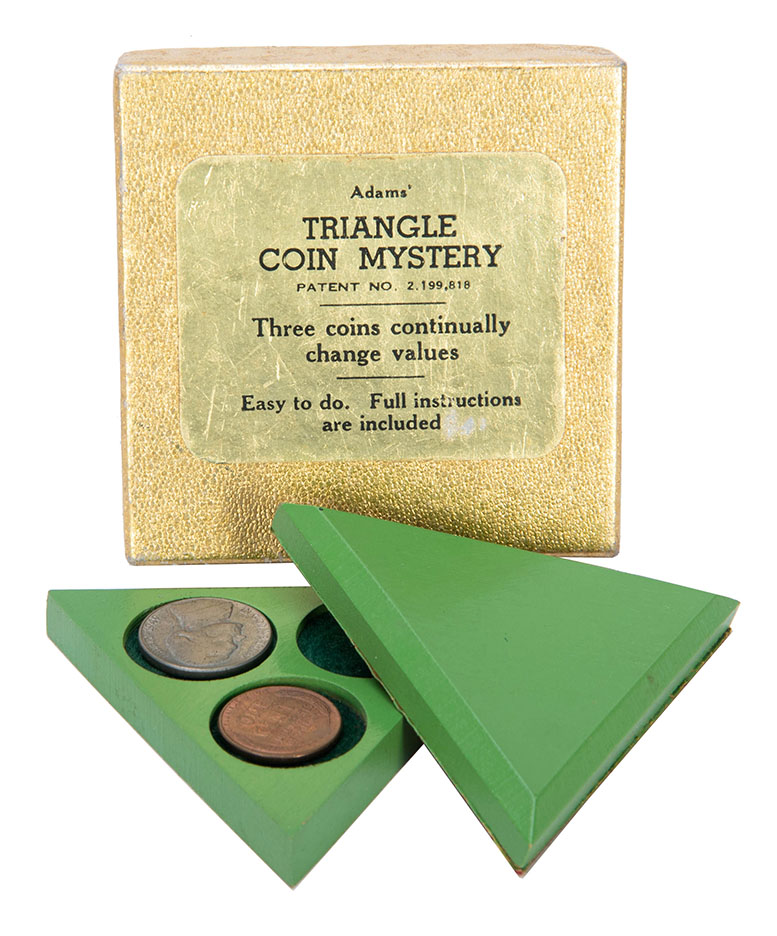 Three coins - a nickel, a penny, and a dime are selected from several other coins. They are laid in the holes in the bottom block. Each time the cover is placed over them, they change denominations. Includes the original box and instructions. Very good condition.