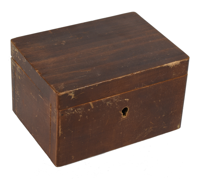 Locking hardwood box from which a borrowed watch or other small object vanishes. Lined with green velvet, green felt bottom. Surface scratched, mild wear internally. Good condition.