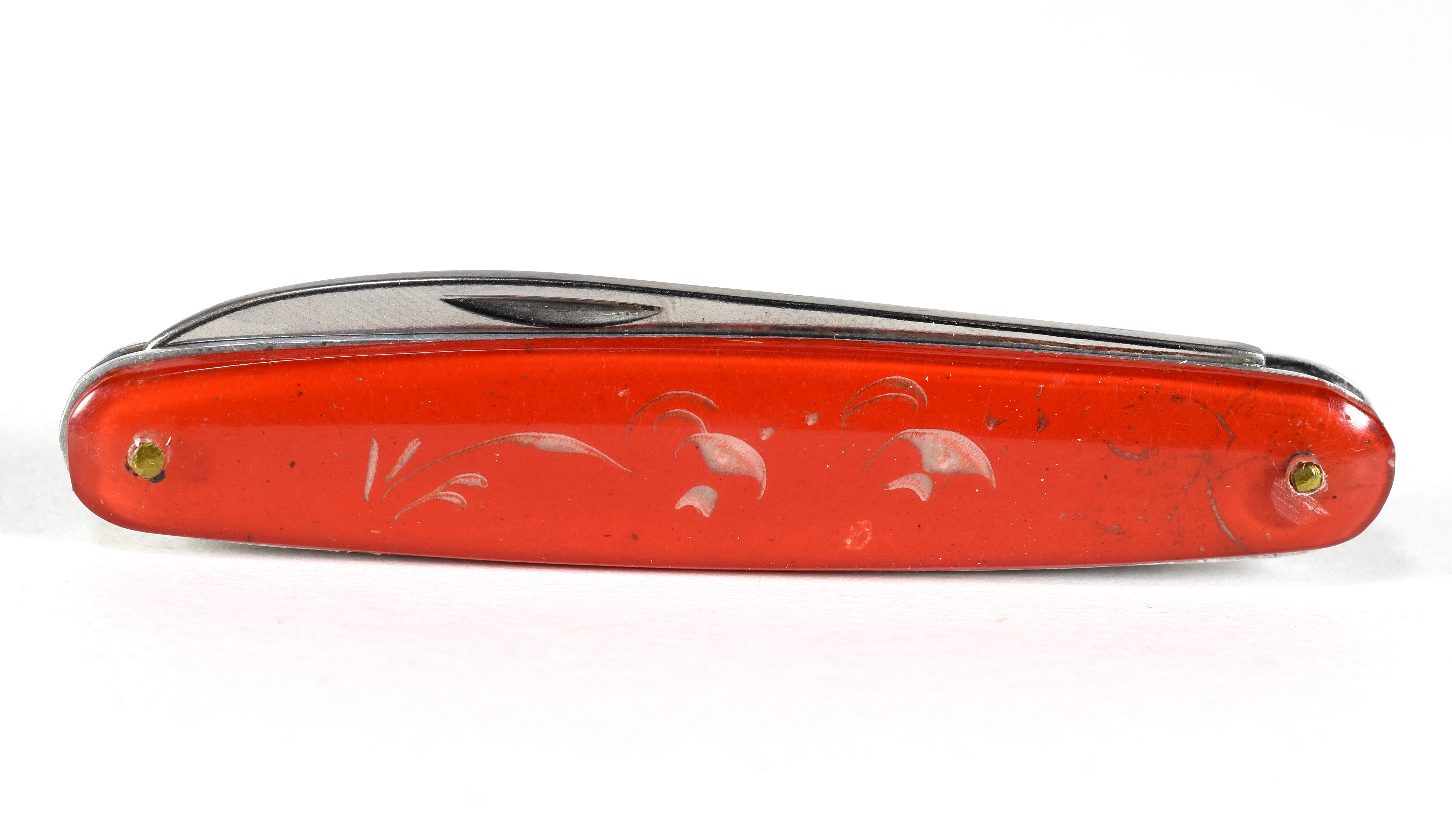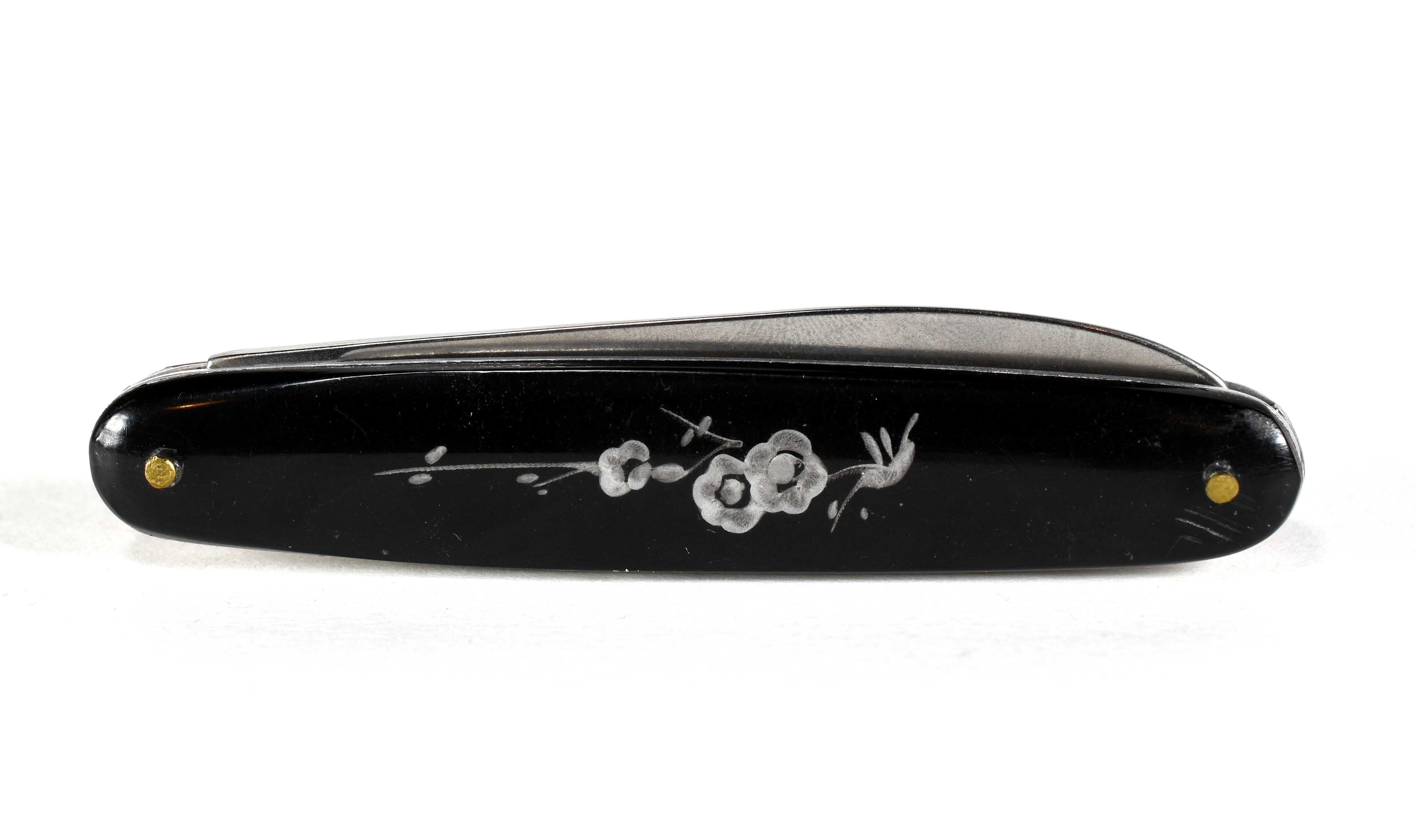 Standard set of three knives, red/red, black/black, and red/black. These knives also feature a delicate flower motif on both sides. No bolsters, red/red knife with two blades, the others with one each. A one-of-a-kind set custom made by Ray Szwec at for J.P. Jackson. Shows some wear, but still a beautiful, unique, set.