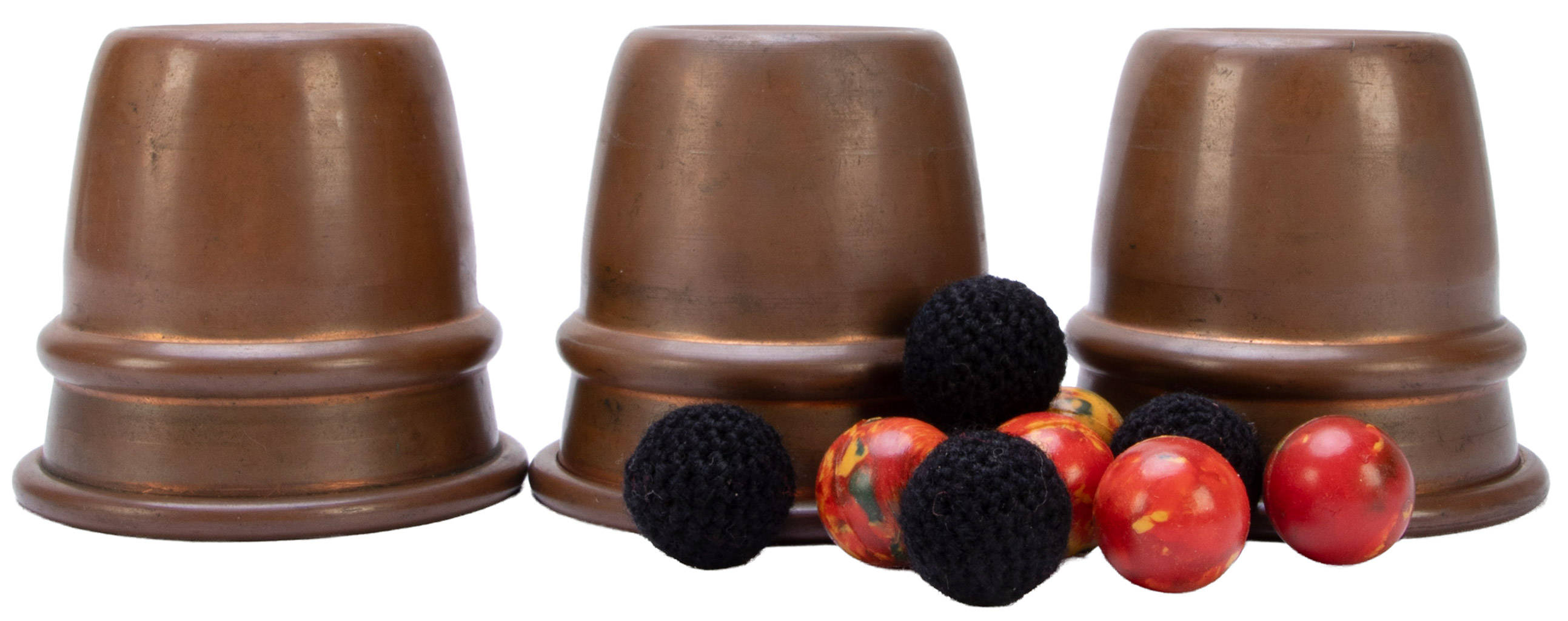 Three heavy cups made after Ross Bertram′s design, spun from copper. Includes five plastic balls and four crochet balls. Mild oxidation inside the cups, else in very good condition.