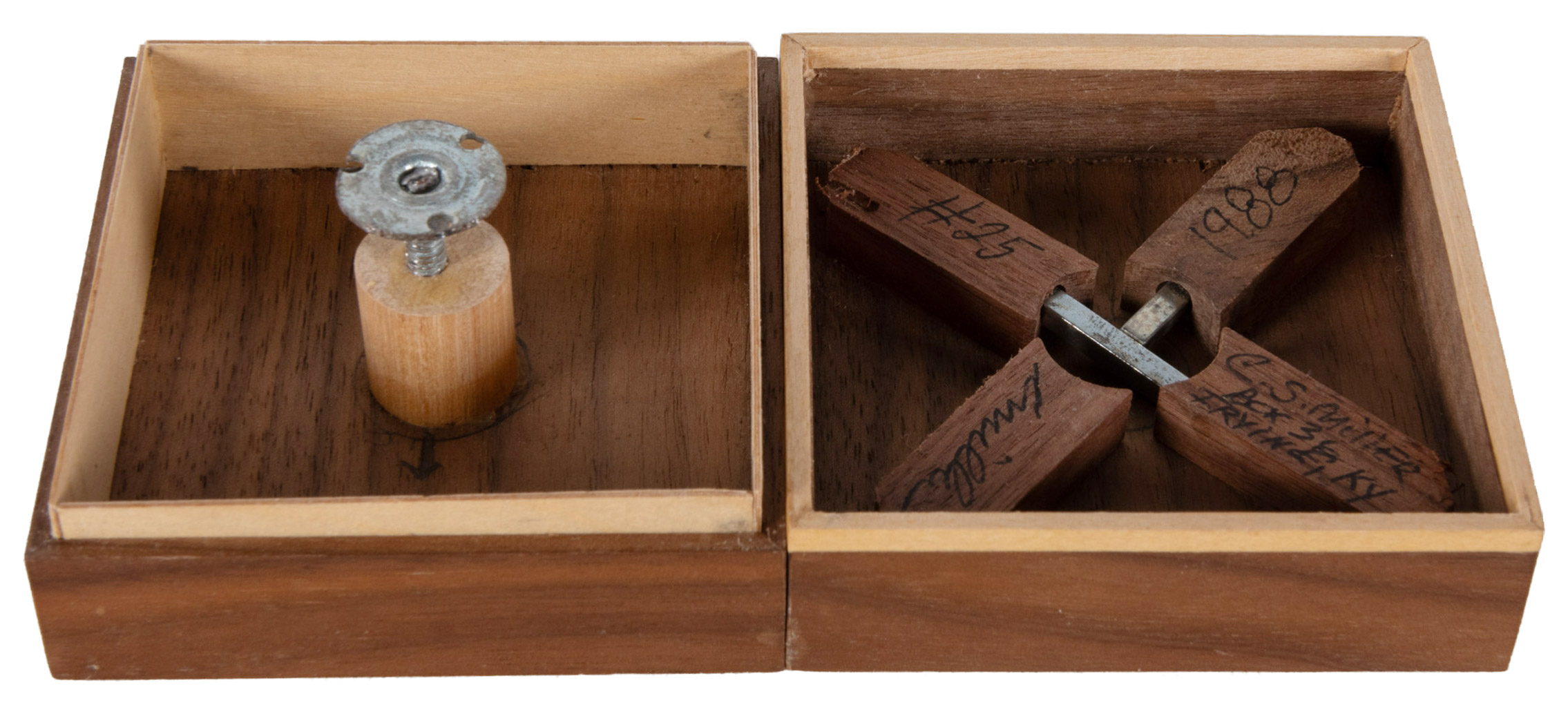 Number 25. A finely made wooden puzzle box made by Clarence Miller. The puzzle is how to open it since the box has no apparent handles or fingerholes. Only those who know the secret can open it! Signed by the maker on the interior. Very good condition.