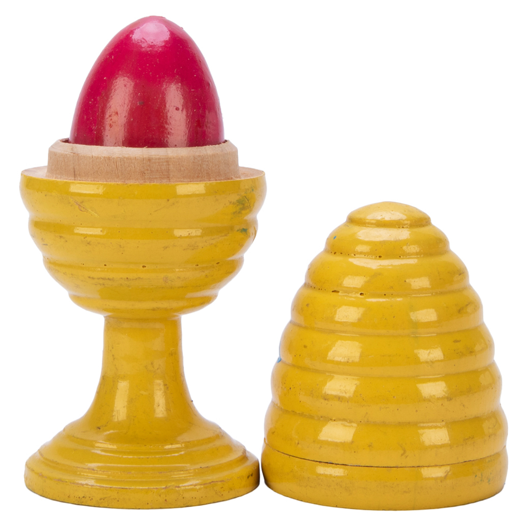 A vintage wooden color-changing egg vase with one pink egg and a blue shell. Shows some wear, else in good condition.