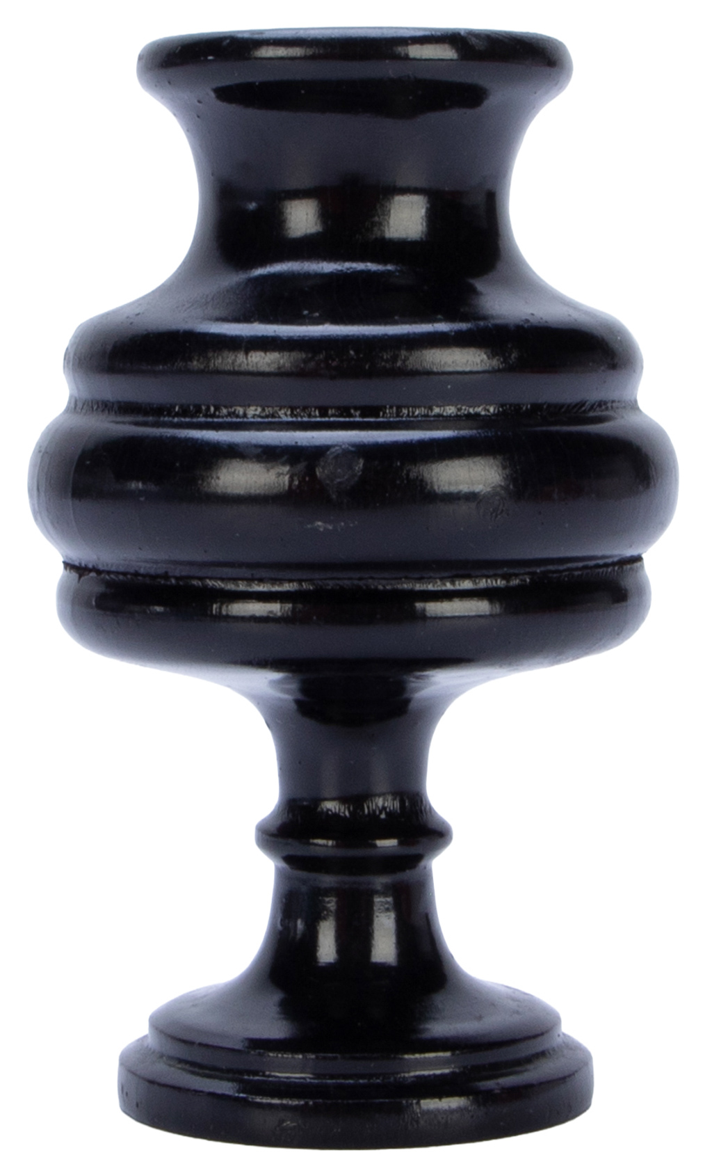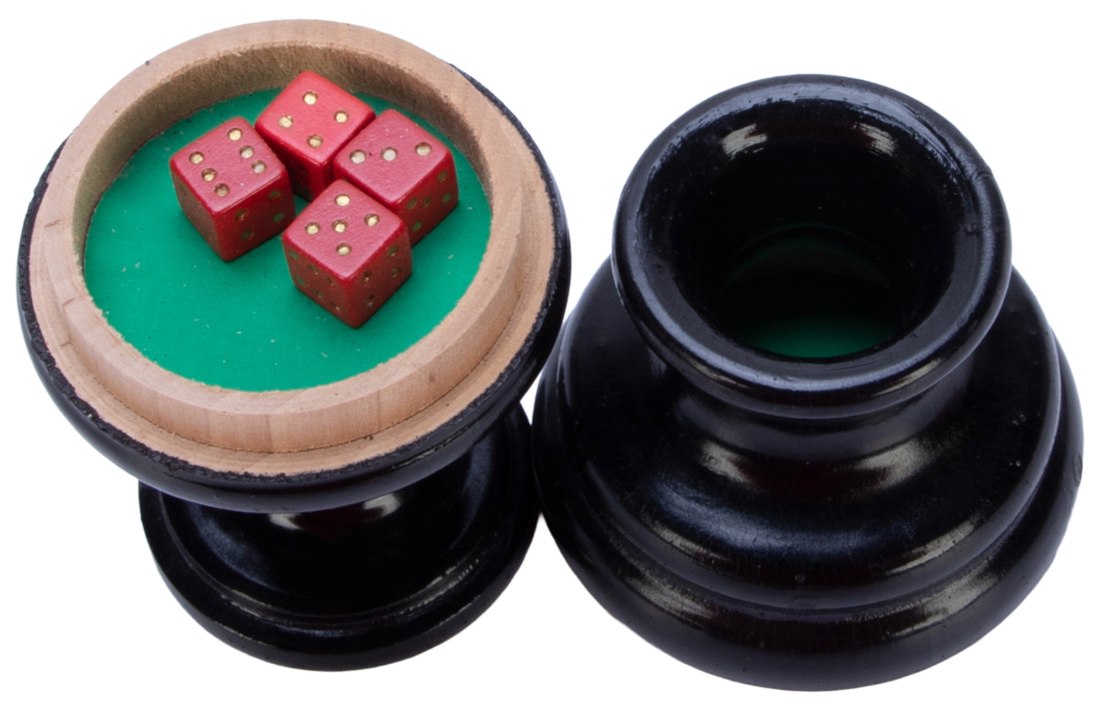 Wooden vase, painted black. The magician instantly guesses the roll of the dice. Includes four small red wooden dice. Very good condition.