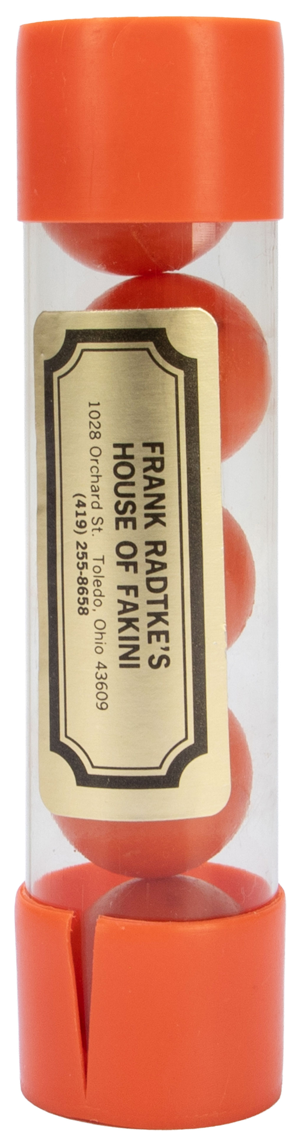 A set of five small orange manipulation balls in the original case. A few soiling spots, cracks to the caps, else in good condition.
