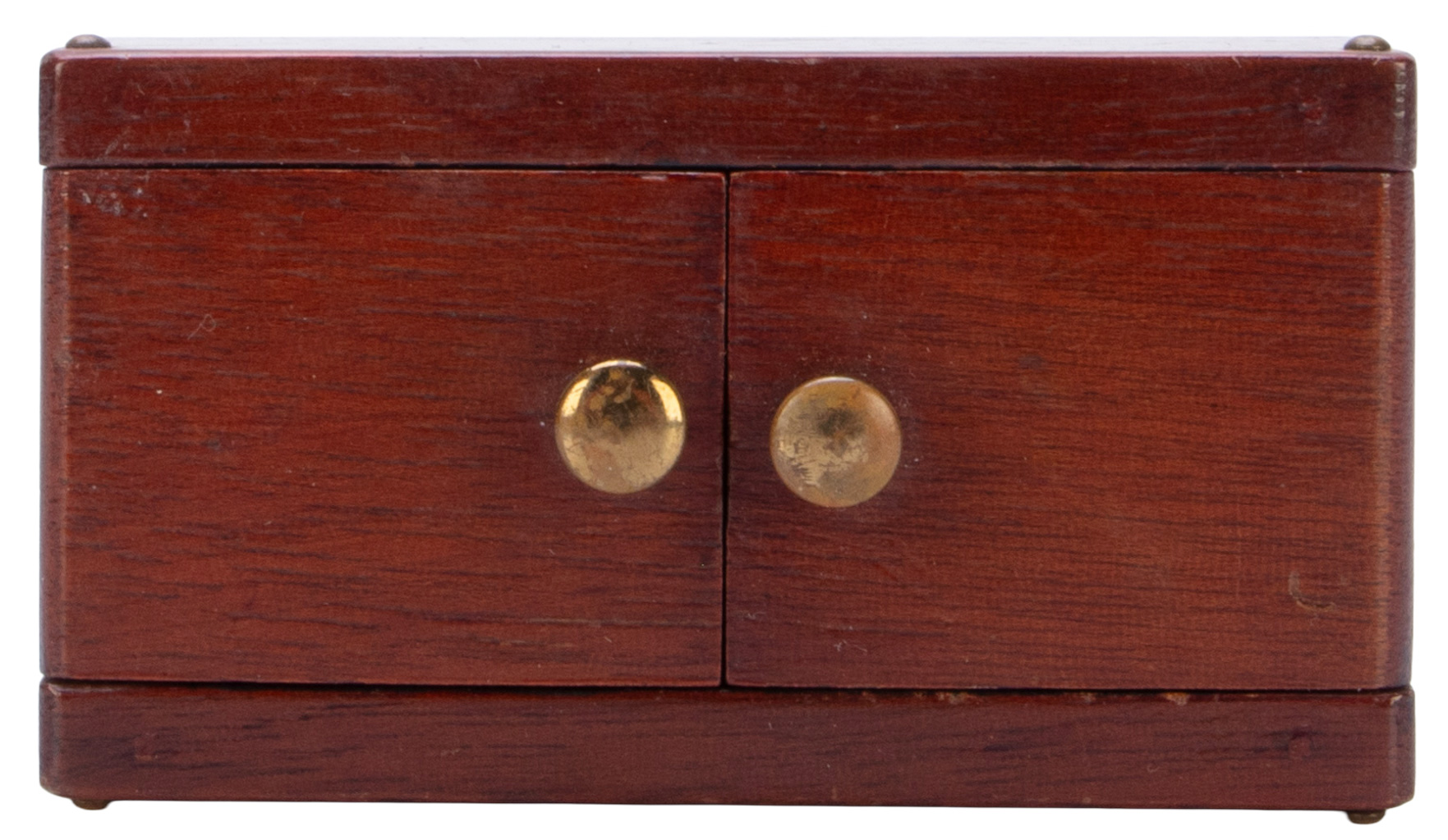Wooden box with doors into which a half dollar is placed. After considerable "by-play" tilting the box back and forth, the coin is shown to have vanished, ala the Die Box. Finley made from hardwood with spring-activated hold-back switch at rear for the vanish of the coin at the conclusion. Half dollar size. Mild wear, else in very good condition.