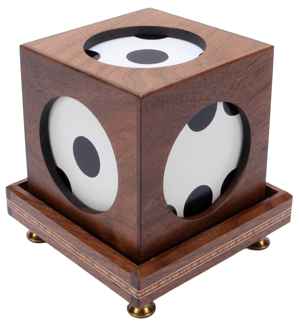 A large white die vanishes from within the framework box only to be discovered elsewhere. Includes die, box, gimmick and pedestal. Similar to the P&L model called the Phantom Die. Hallmarked. Near fine/excellent condition.