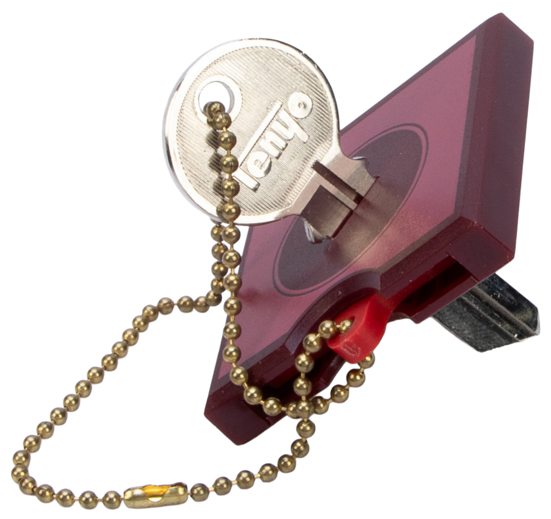 A coin is placed into a small holder at the end of a key chain. The holder is inserted into a frame, and then the key is pushed right through the center of the coin: metal through metal. Then the coin is shown to be unharmed. Created by Atsushi Fukano. Very good condition.