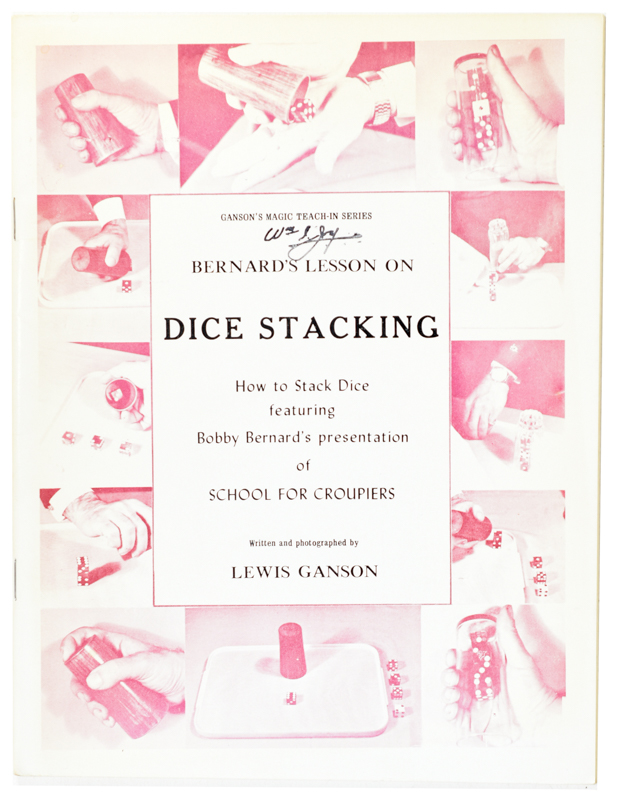 Bernard's Lesson on Dice Stacking (Ganson's Magic Teach-in Series). Pictorial wrappers, 23 pages, photo illustrated. Features Bobby Bernard's presentation of School for Croupiers. Toning to covers and pages. Very good condition.